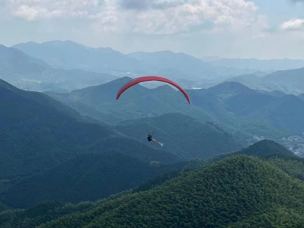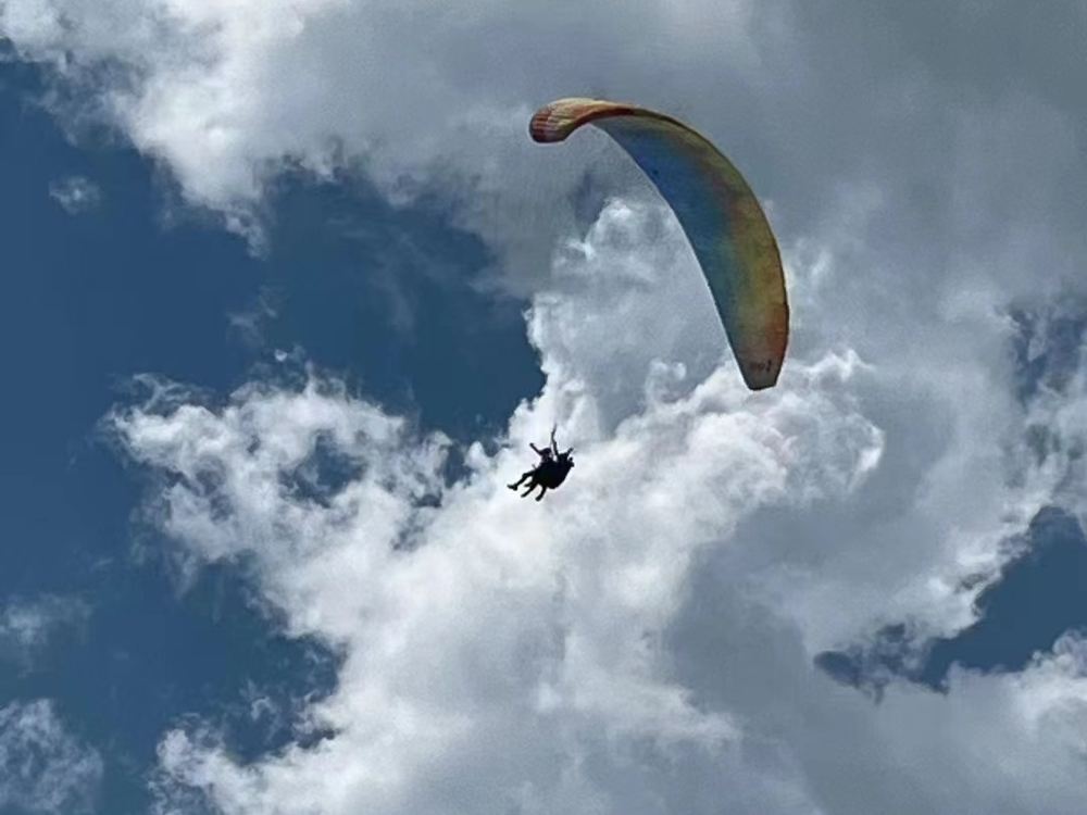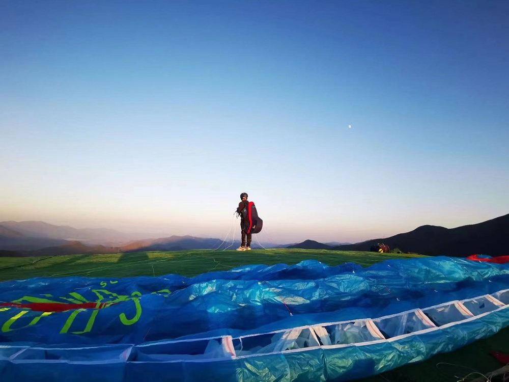 7、滑翔傘起傘(起飛)時,請您務必全力配合教練,身體微微前傾,協同用力,控制身體重心用力向教練指示方向奔跑,直至飛出山體為止;