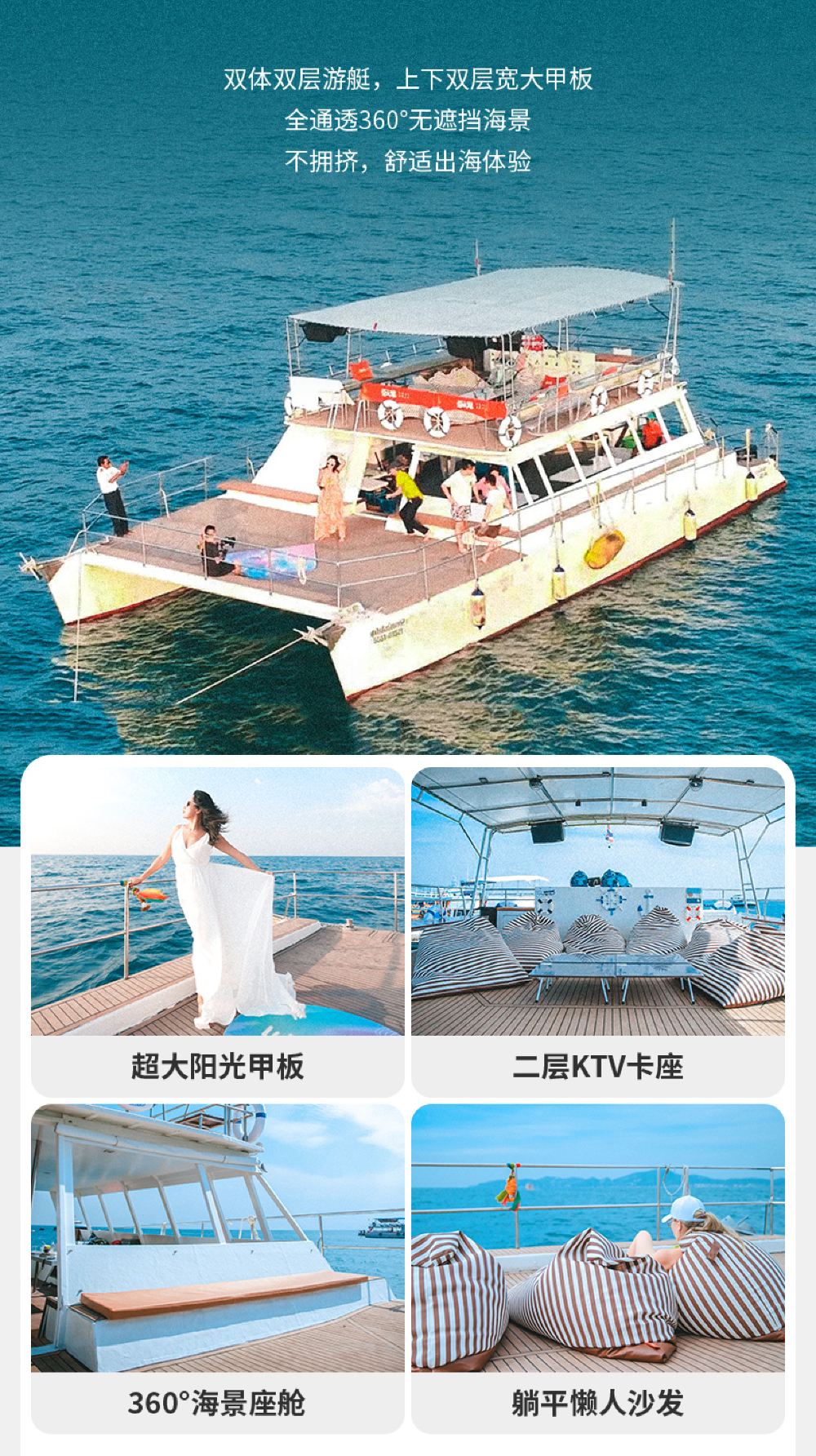 雙體雙層遊艇,寬敞露天甲板,提供淡水淋浴;
