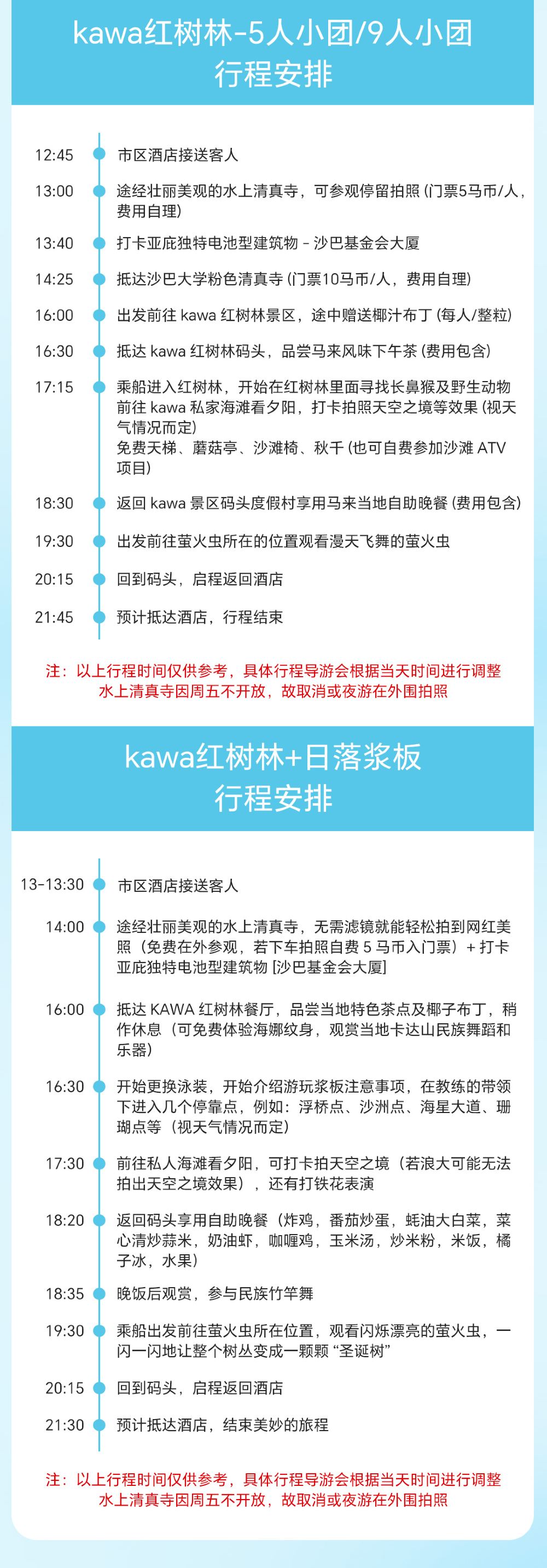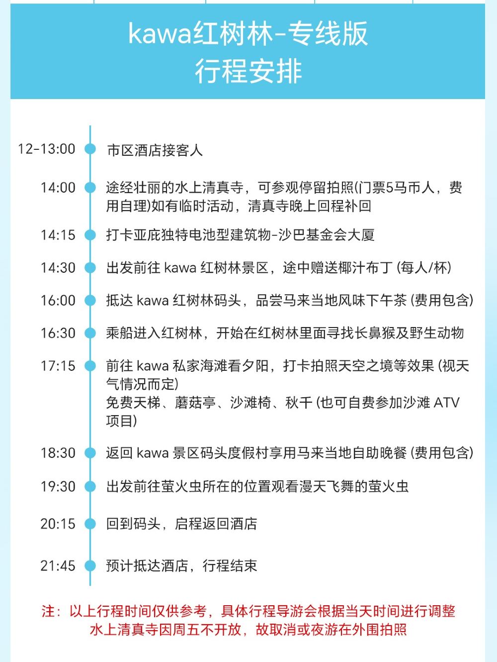 - 6.水上清真寺或沙巴大學門口禁止衣著暴露,並且禁止做出不雅的行為,如因顧客不雅行為導致的一切後果由顧客承擔,其中包含相應法律責任。