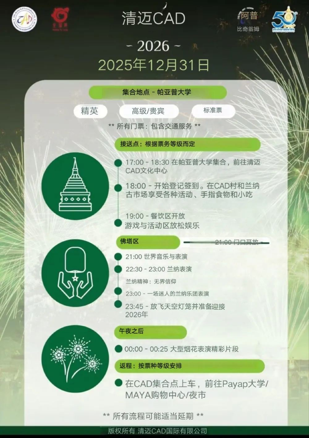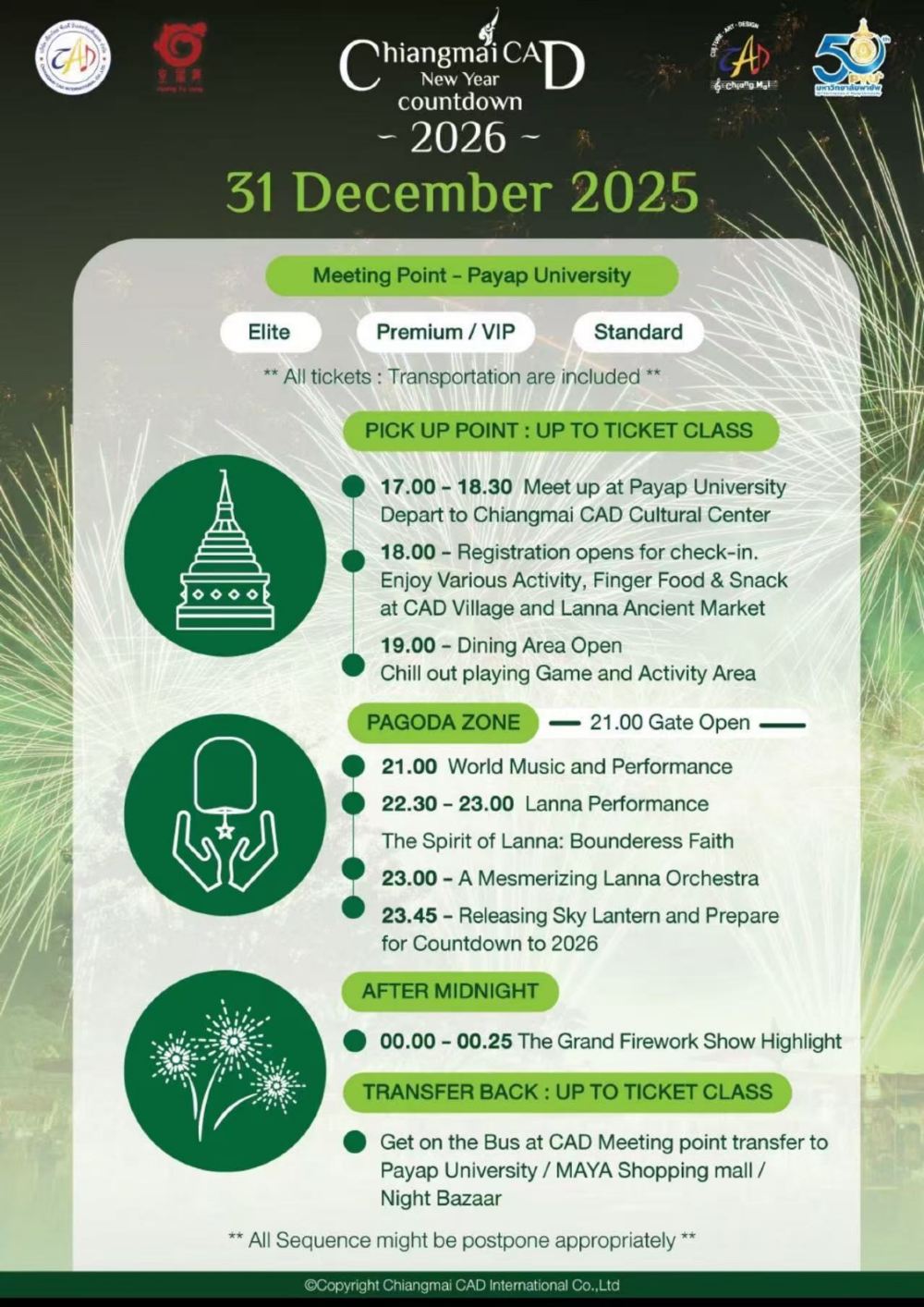 3.持VIP和Premium票型的觀眾將由10-12座廂型車從Payap清邁西北大學接送至現場,持Standard票觀眾將由雙條車從Payap清邁西北大學接載至現場。