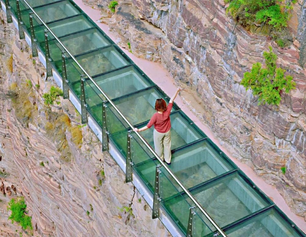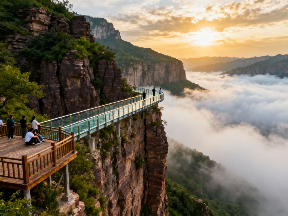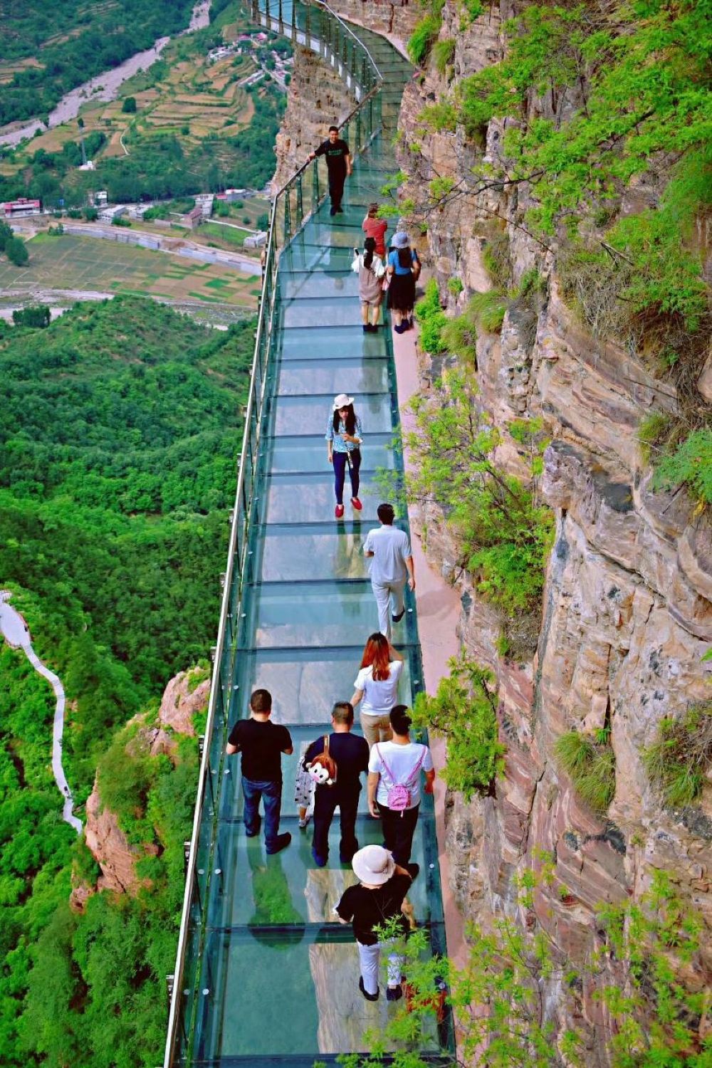 ▲ 建造於海拔1000公尺以上的絕壁上,蜿蜒盤旋於山脊之上,神似遊龍,玻璃棧道、石質棧道、觀景台等一應俱全,建成後將成為華北地區最長的山脊棧道。景區開放後,遊客可登臨棧道,近距離感受大山的雄壯與秀美。因地勢高,雨後乍晴,常有繚繞的白雲沿著山谷升起,沿著站到綿延,行走於棧道之上,如踏雲而行,此時漫步棧道,美哉壯哉,因此有“雲端棧道”之美譽。