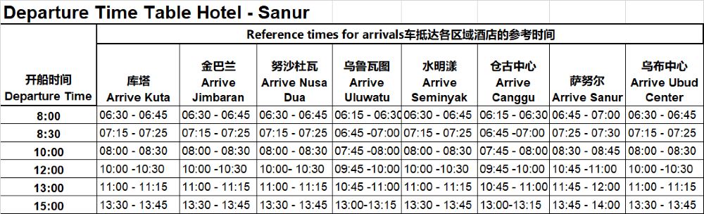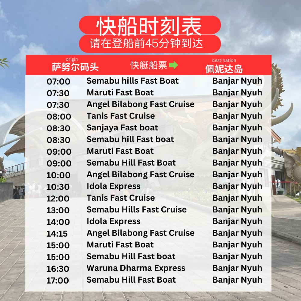 1、時間為開船時間,車會提前60-90分鐘去飯店接您,請提前預留等候時間,峇里島飯店接駁區域:薩努爾區域、烏布中心、庫塔、水明漾、倉古中心、金巴蘭、努沙杜瓦,司機會在峇里島飯店接您並送到薩努爾碼頭貴賓室,請您準時在飯店大廳耐心等待。超出以上指定區域如需接駁,需額外收取人民幣50元/人的費用,請直接線下付款給司機即可。