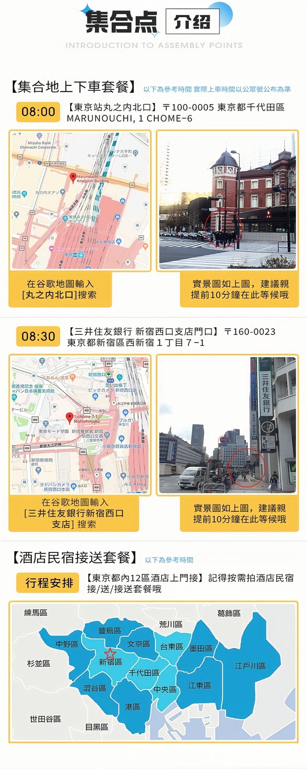 17:30 pm 抵達JR東京站丸之內北口/新宿西口三井住友銀行門口,愉快地結束當天的行程!(集合地上下車的貴賓可在東京站或新宿直接散團結束行程。)