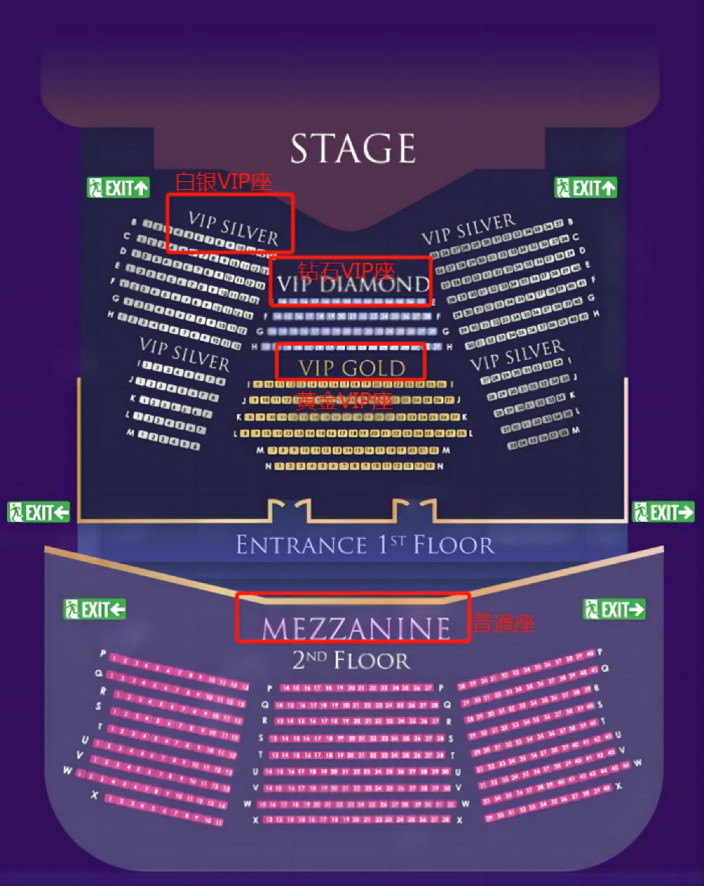 演出入場門票的種類分為一般座位、白銀VIP座、黃金VIP座、鑽石VIP座四種。