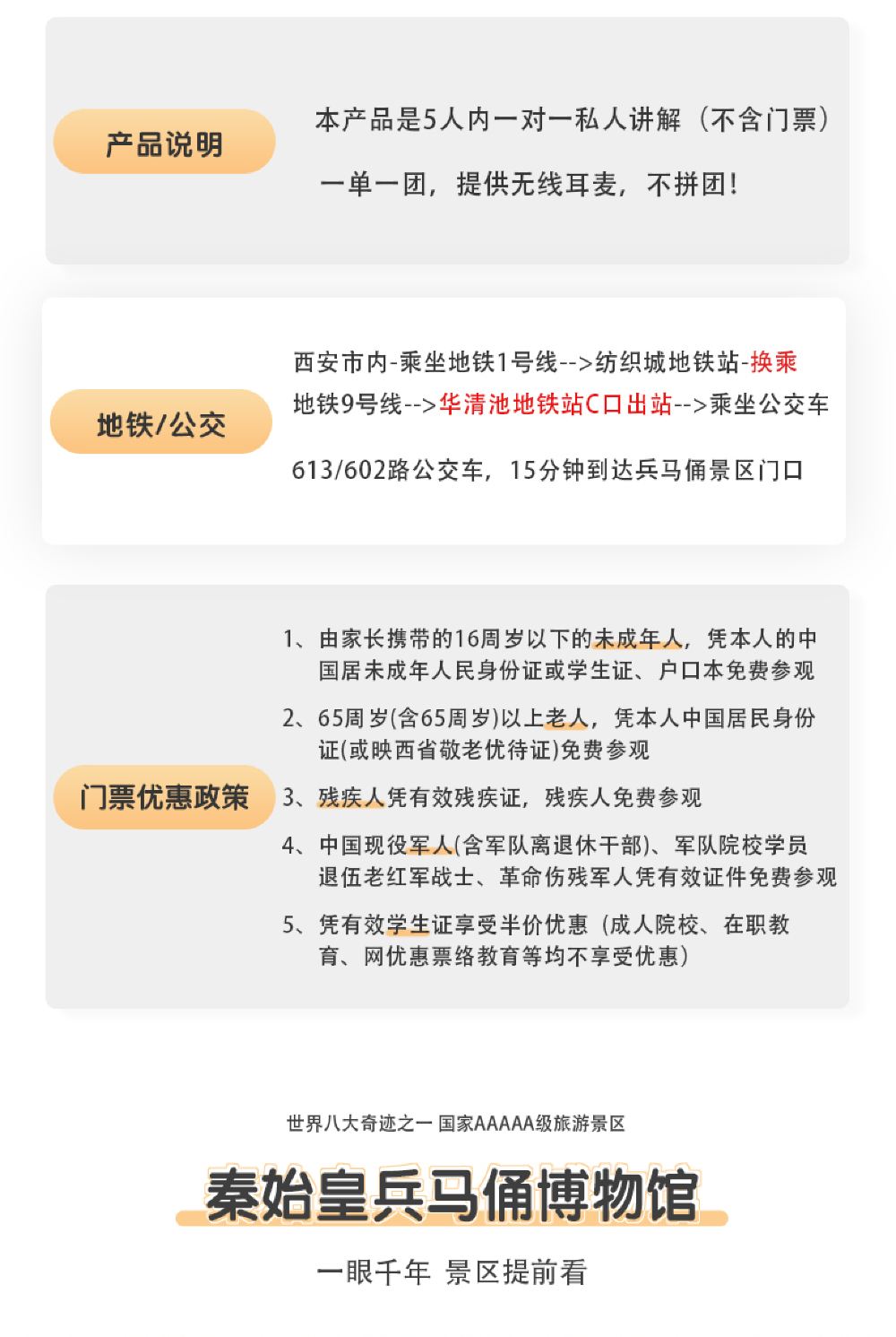 1.本產品為秦始皇兵馬俑獨立包團純講解服務;根據您的需求選擇選項下單(不包括入場門票)