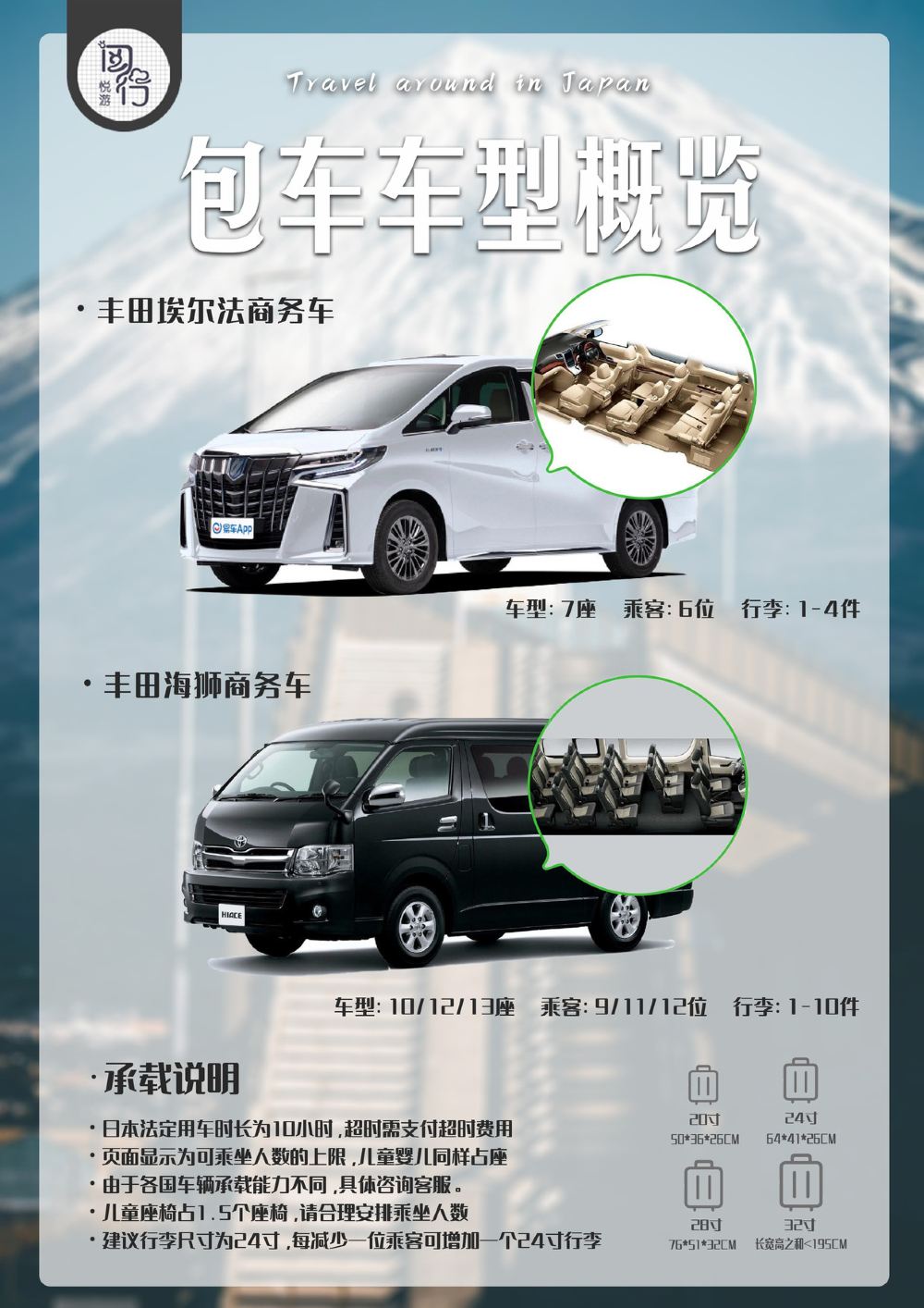 7 人座中型廂型車、12 人座中型巴士、5 人座標準車型