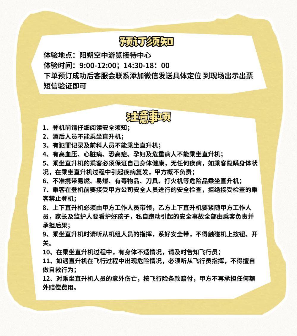 10、上下直升機必須由甲方工作人員帶領,乙方上下直升機要緊隨甲方工作人員,家長及監護人要看護好孩子,私自跑動引起的安全事故全部由乘客負責並承擔後果;