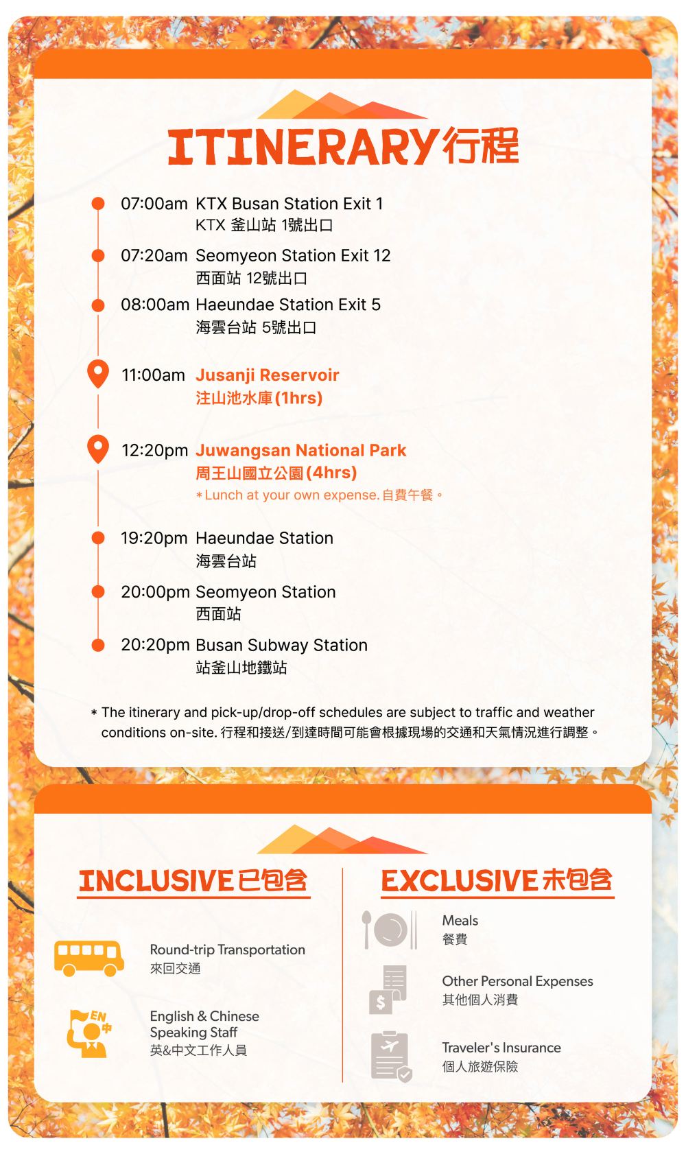 舒適來回交通|釜山多站出發,搭乘巴士輕鬆前往周王山,省去交通煩惱,享受無憂便捷的秋季賞楓之旅。