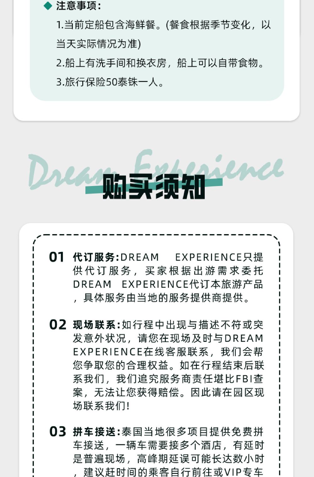 1 現場聯繫:如行程中出現與描述不符或突發意外狀況,請您在現場及時與DreamExperience 的在線客服聯繫,DreamExperience會幫您爭取您的合理權益。如在行程結束後聯繫我們,我們追究服務商責任,無法讓您獲得賠償。因此請在園區現場聯繫我們!