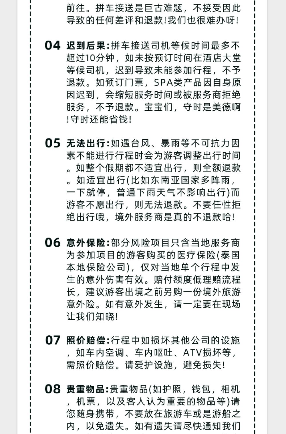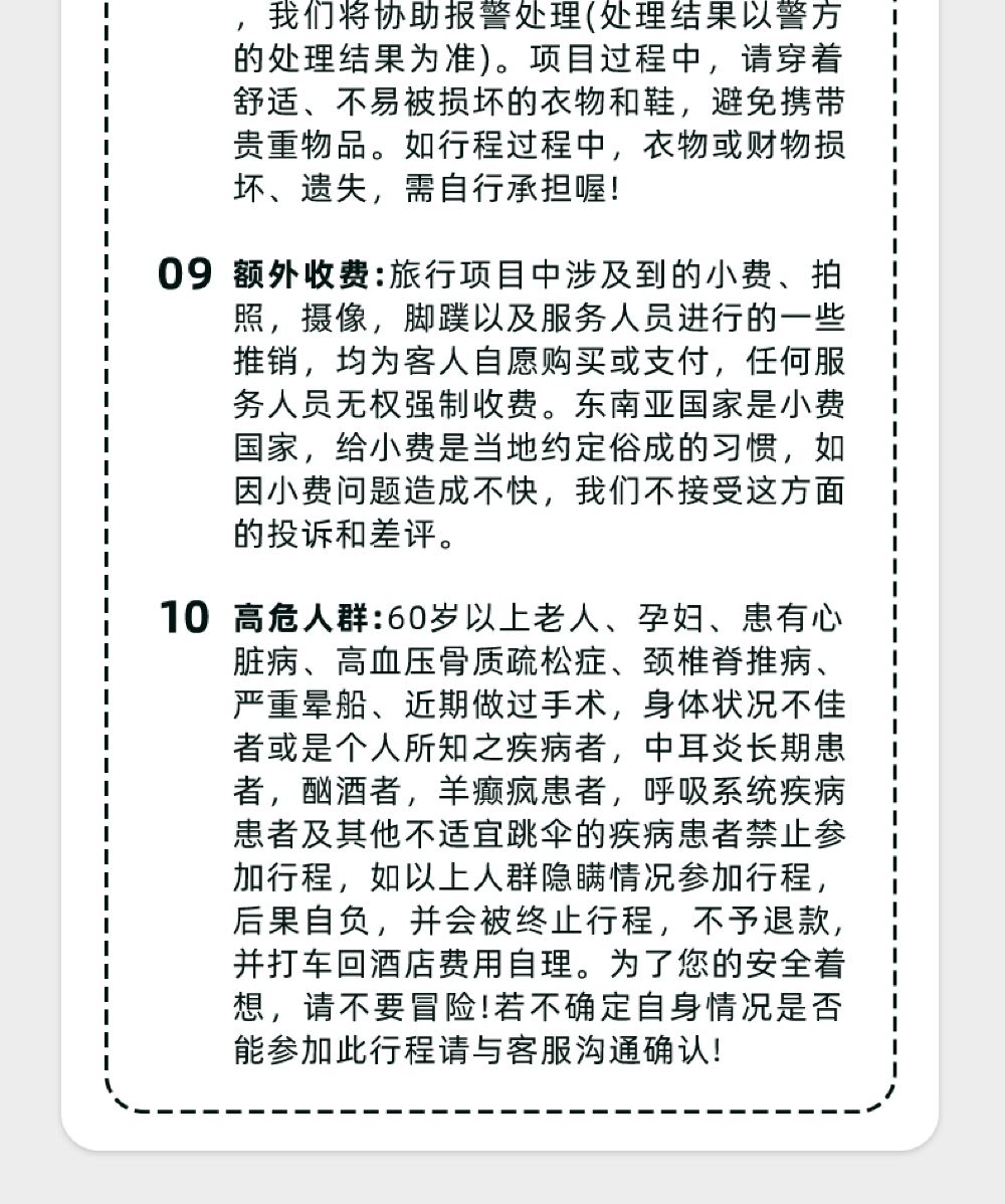 2.無法出行:如遇颱風、暴雨等不可抗力因素不能進行行程時會為遊客調整出行時間。如整個假期都不適宜出行,則全額退款。如適宜出行(比如東南亞國家多陣雨,一會就停,普通下雨天氣不影響出行)而遊客不願出行,則無法退款。不要任性拒絕出行哦,境外服務商是真的不退款哈!