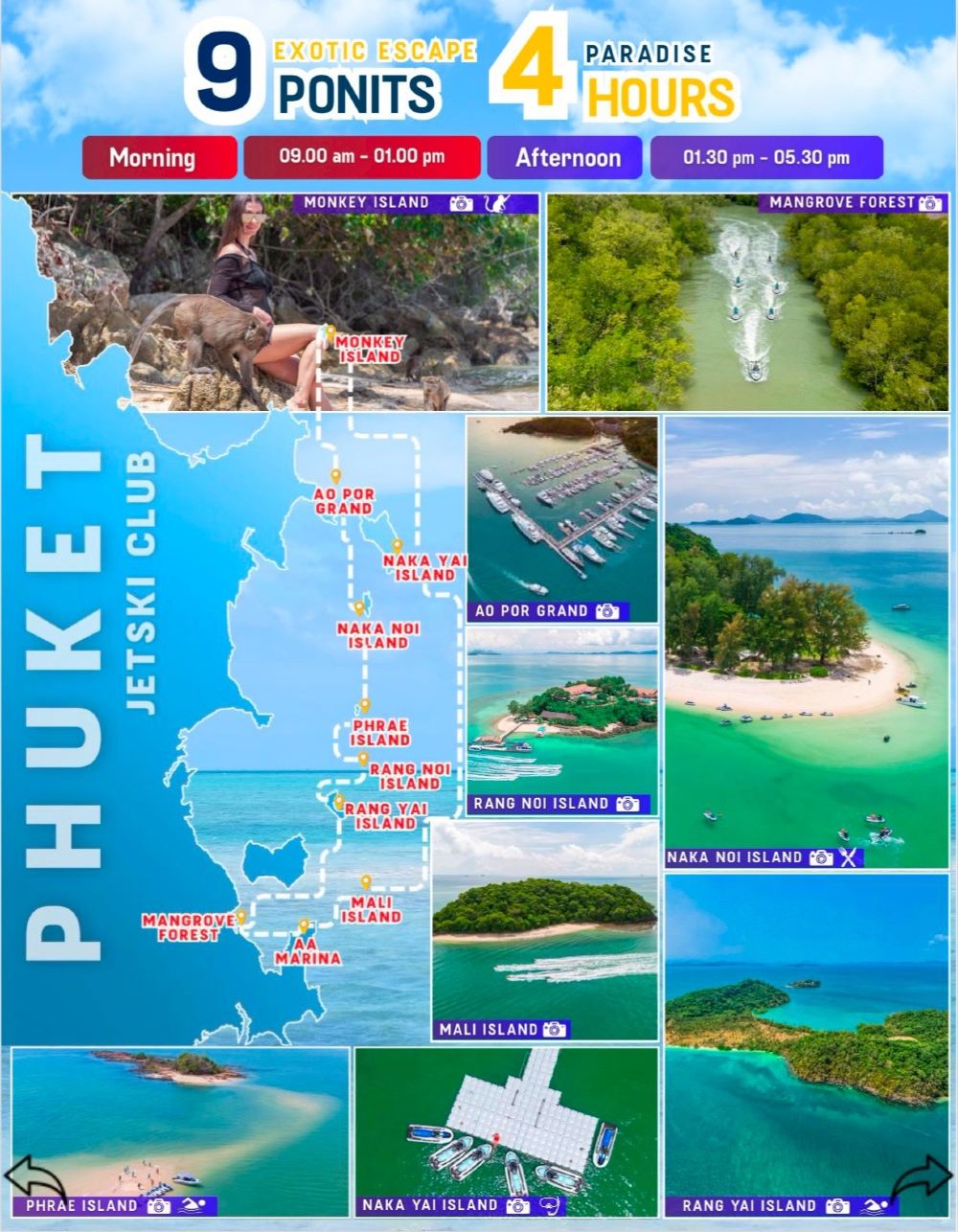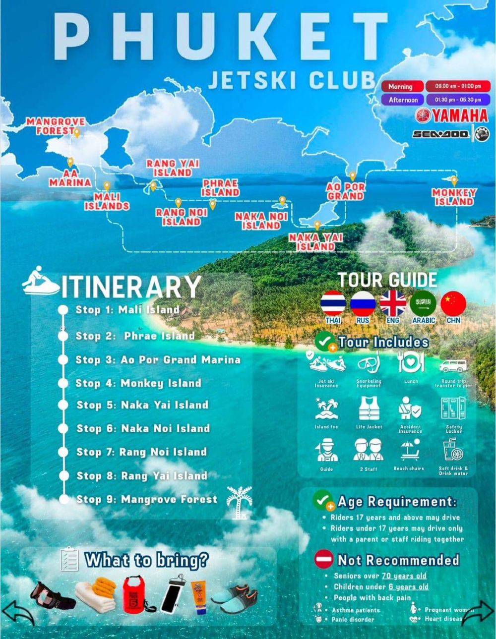 費用包含:指定區域來回接送、餐、飲用水、軟飲、浮潛設備及救生衣、英文/俄文指導教練