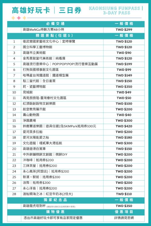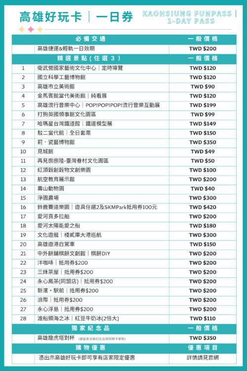 精選多元景點,可輕鬆享受高雄的精緻美食、海港城市的熱情和豐富的文化體驗(1日卡任選3、3日卡任選5)