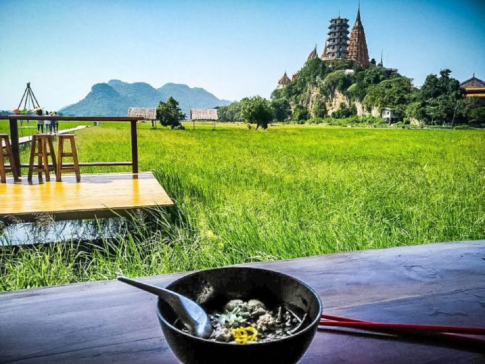 矗立在稻田中的美景餐館,360度放眼望去是一片綠油油的田野風光,還可遠眺雄偉的虎穴寺與金佛。田野碧波蕩漾,徐徐微風吹來,大自然風光映入你的眼簾,配上一碗道地泰式粿條,好不愜意。