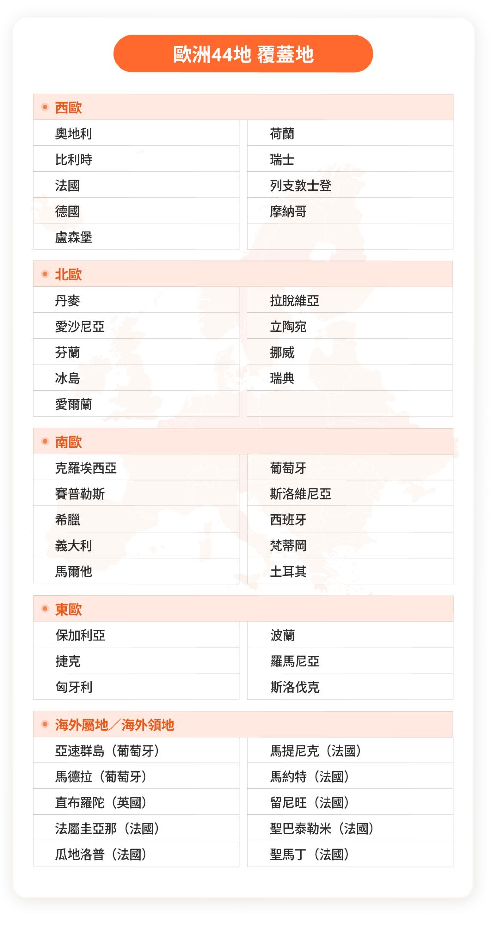 • 網路覆蓋:英國 + 歐洲44國(請見下方詳情)