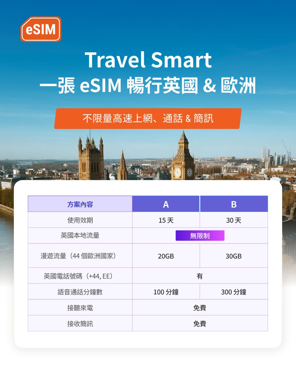 英國 30 天無限高速流量+300 分鐘通話/免費接收短信(含EE本地號碼)