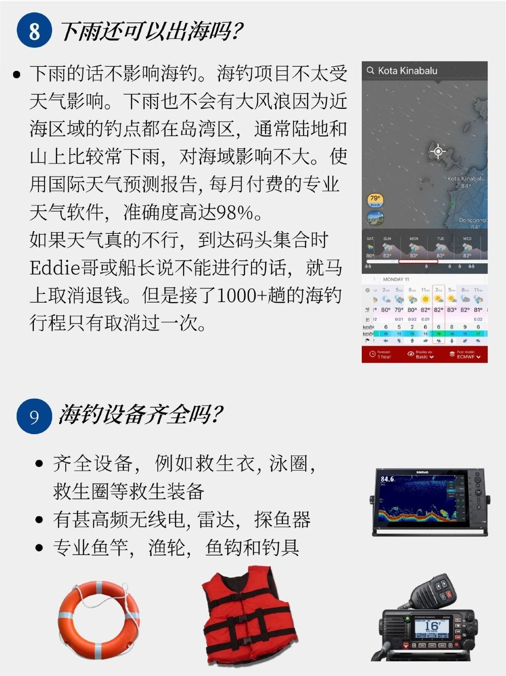 - 配備衛浴設備、淡水和所有必要的安全裝備,包括救生衣、救生圈、GPS 和 VHF 緊急無線電,確保安全愉快的出遊。