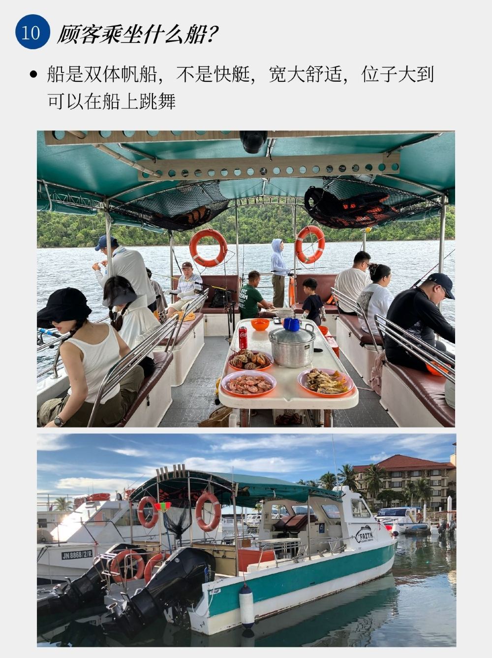 - 我們寬敞舒適的雙體船非常適合家庭和初學者,最多可容納 12 位旅客 (不含工作人員)。