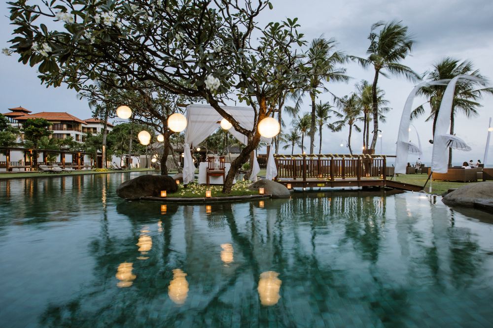 ▲在泳池畔的私人島嶼之一,體驗浪漫晚餐。