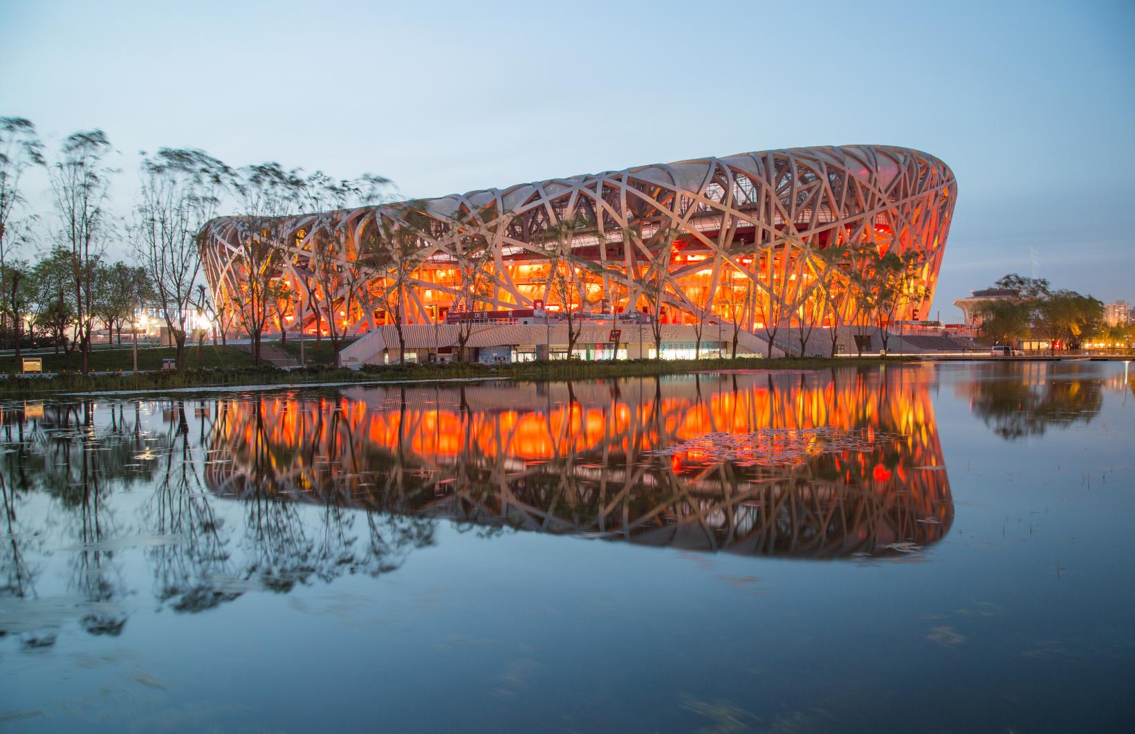 ▲ 夕陽映照鳥巢,水面倒影如夢幻般絢麗,現代建築與自然完美交融