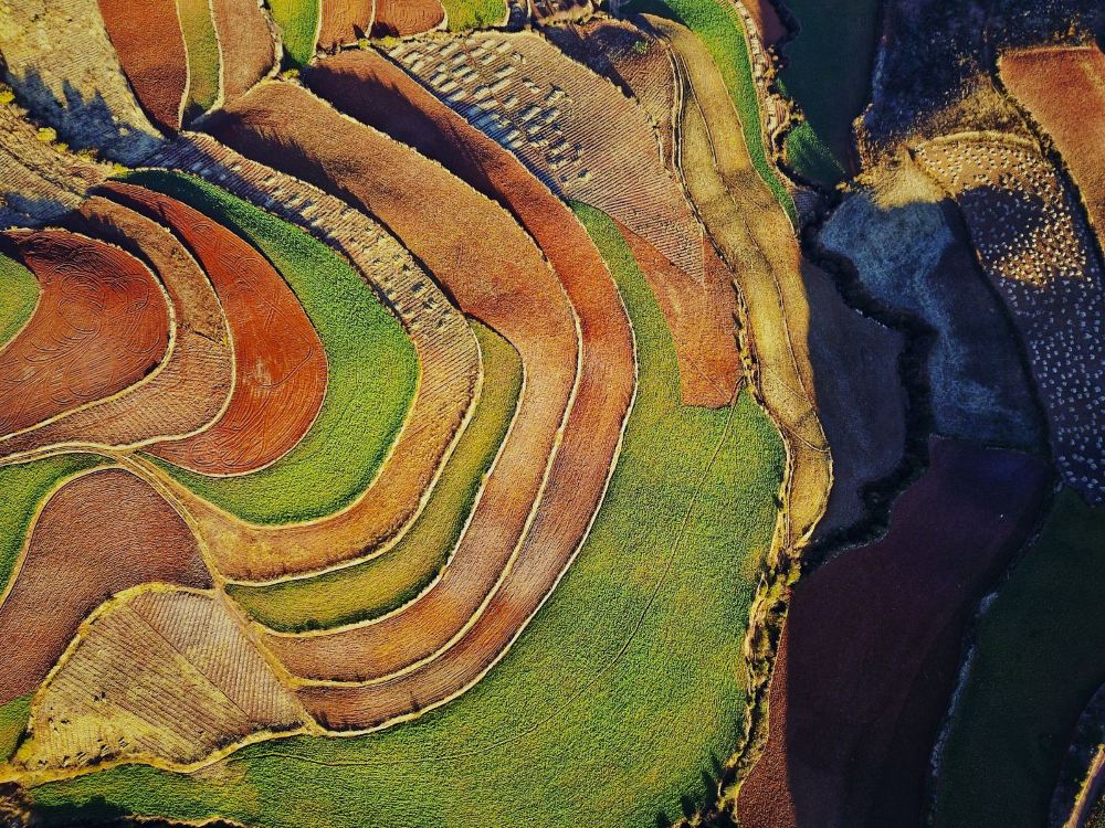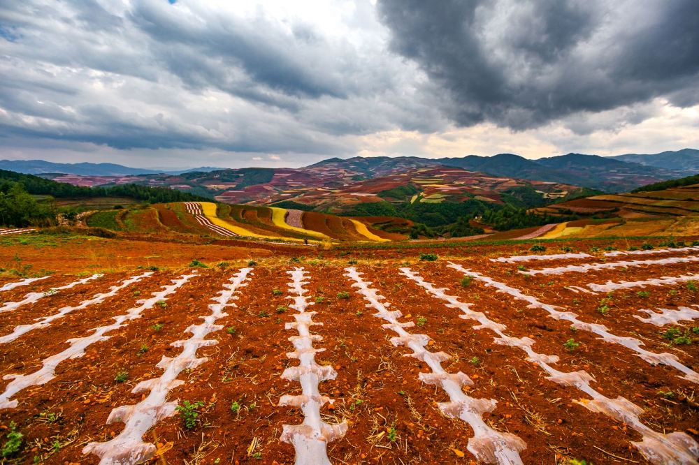 ▲ 前往達馬坎,這是一個制高點,能俯瞰整片紅土地的壯麗全景。晨霧常在此繚繞,為景色增添如夢似幻的氛圍。欣賞錯落有致的梯田景致,並在這片自然奇景中享用野餐。 下午若有時間,您將造訪較為寧靜但同樣令人驚艷的錦繡園。這裡的田地呈現紅、綠、黃三色和諧交融的景象,展現自然與人文耕作的完美結合。漫步田間並與當地農民交流,了解他們傳統的耕作方式。 下一步,探索東川的亮點——七彩坡。這片斜坡以隨季節變換的鮮豔層次色彩而聞名。
