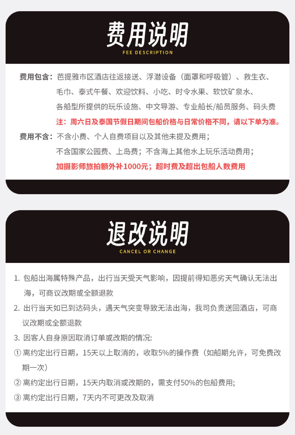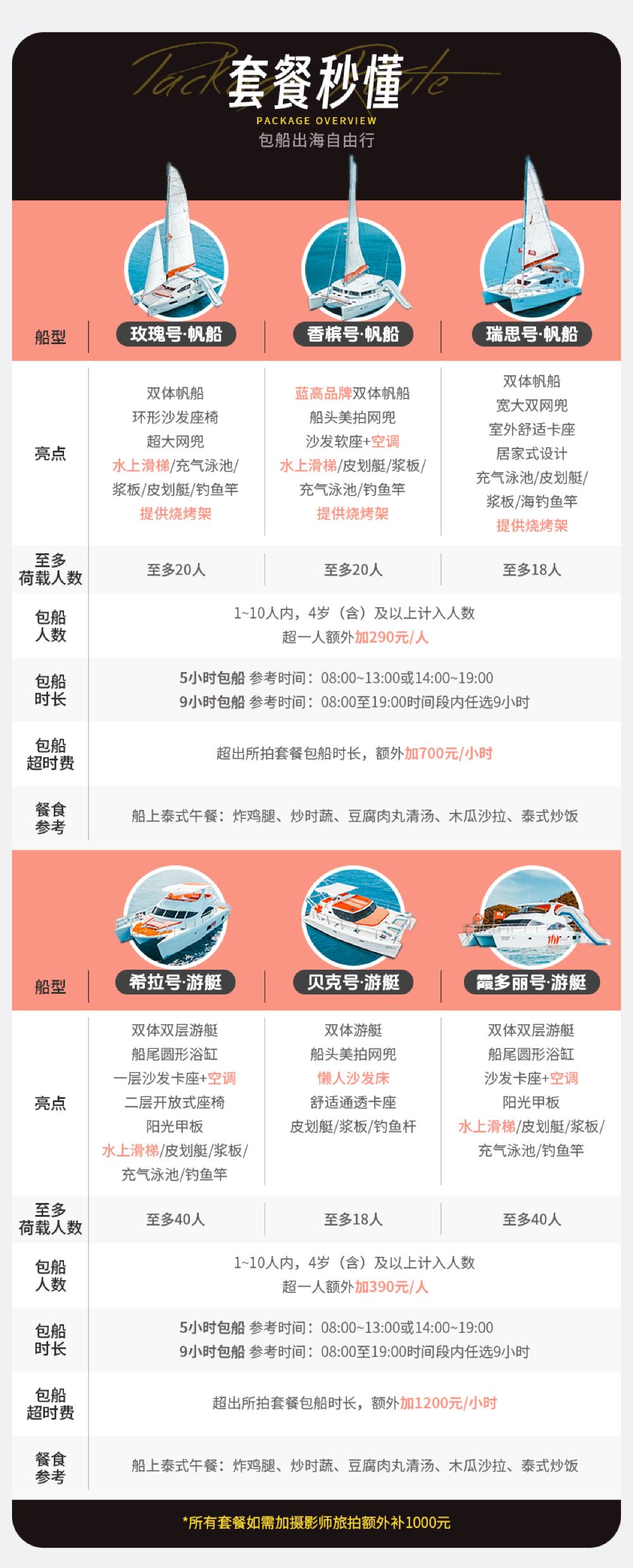 3. 包船行程一般僅提供船隻使用、飲用水和基本浮潛設備等,如超出包船選項人數,或需導遊、碼頭至酒店接送、餐食或玩樂活動等額外服務,請您詳細諮詢在線客服了解並補差。