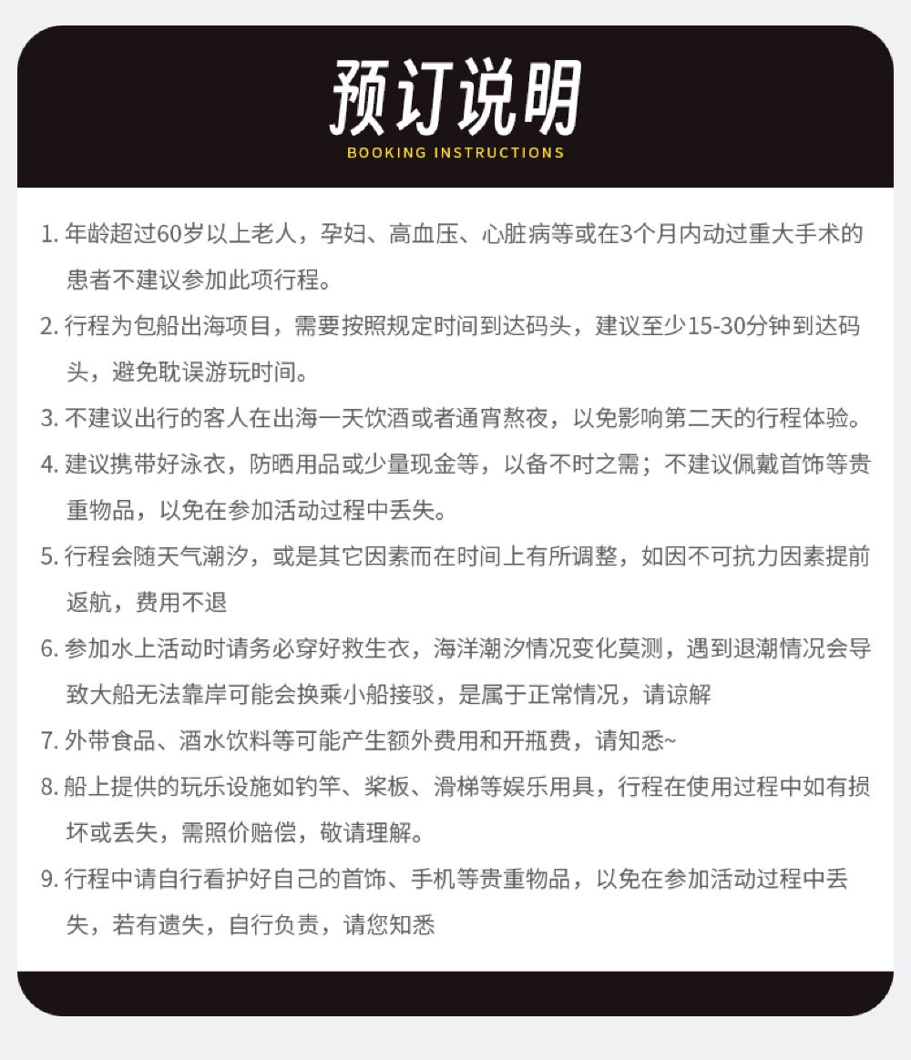 6. 預訂包船後,自行前往請至少提前30分鐘抵達碼頭做好準備,如因您自身原因遲到,費用全損;包船過程中,如超出使用時間需要支付對應超時費用,請注意~