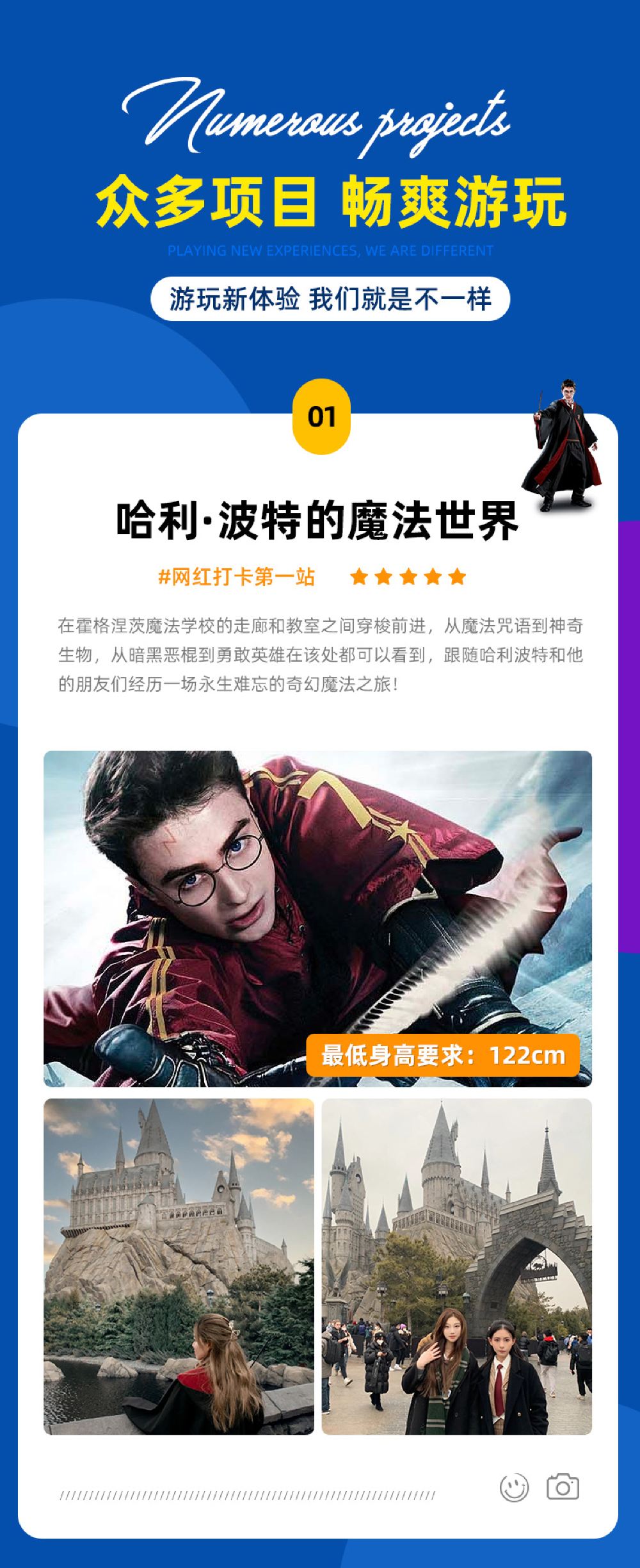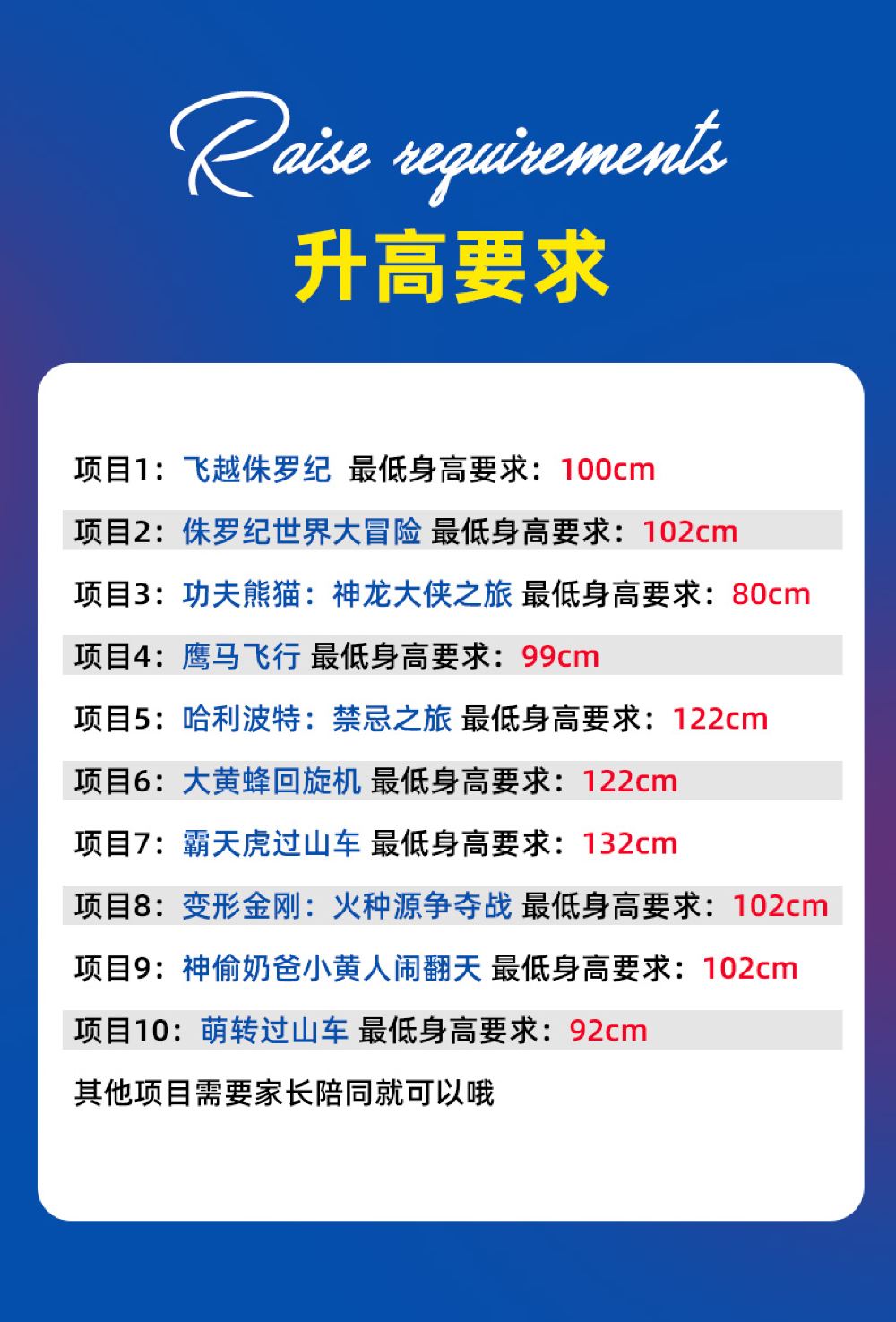 1. 《哈利波特禁忌之旅》身高要求 122 公分;《變形金剛:大黃蜂雲霄飛車》身高要求 132 公分。請務必符合。