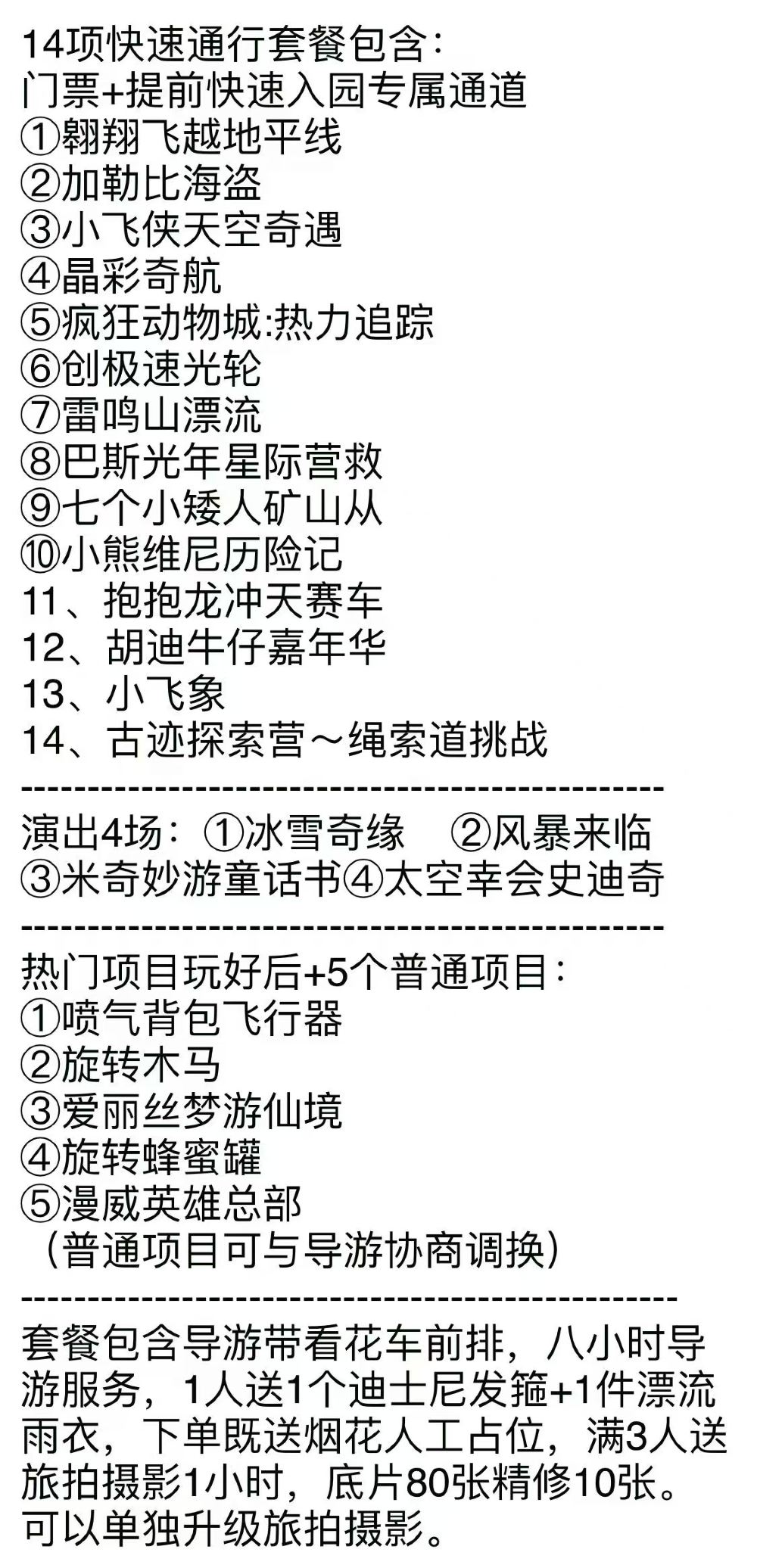 ③【門票+早享卡+導遊服務,多種組合選擇】快速遊玩組合一團最多 10 人、有需求更高的顧客可以聯繫顧客服務中心-量身打造你想要的隨心玩法,迪士尼一共有 14 個熱門項目,請您耐心查看詳情圖片,如有問題將 24 小時為您服務。