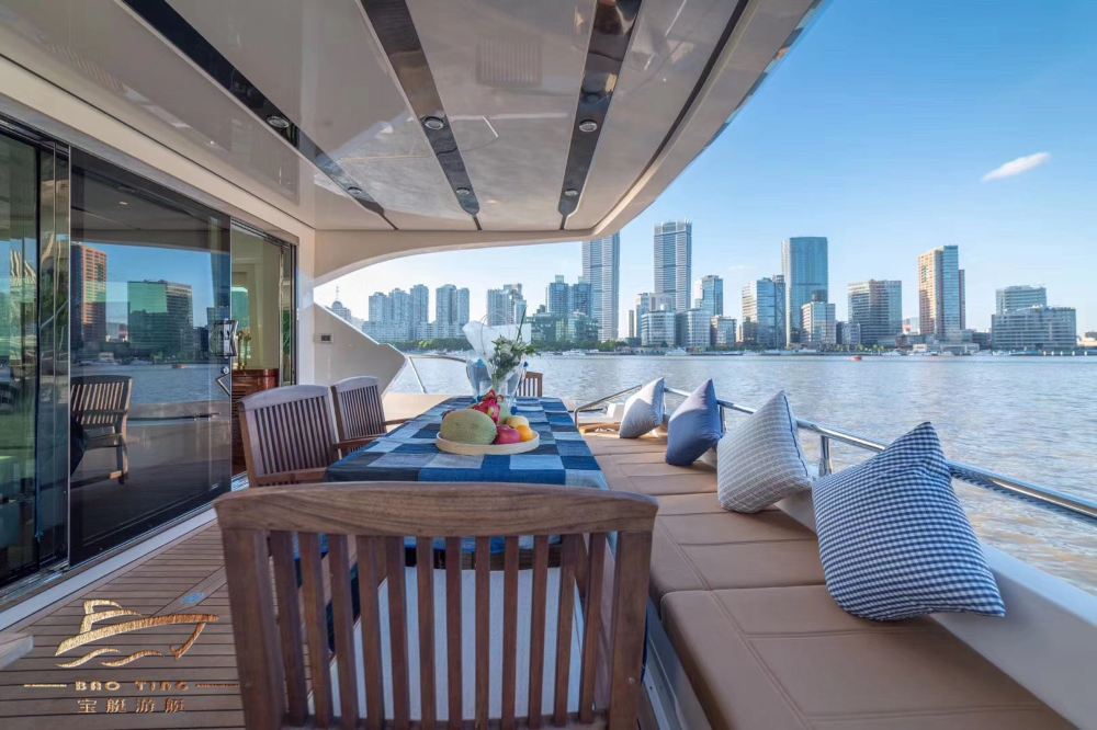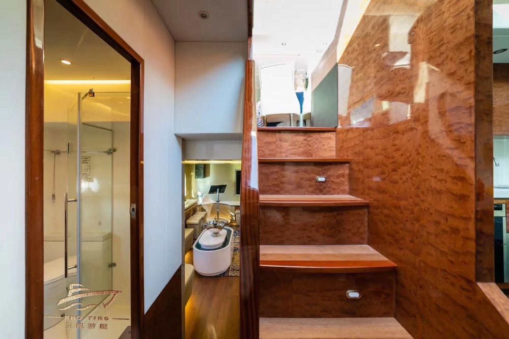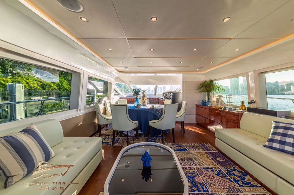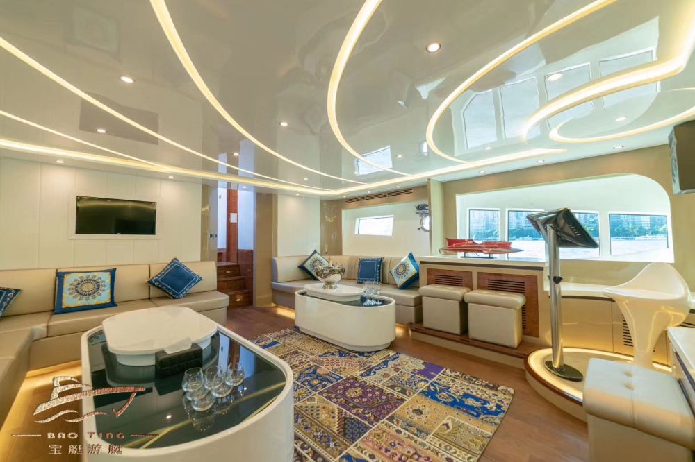 遊艇基礎設施:上下三層、可容納10人。船上配置客廳、臥室、沙發、洗手間、廚房、大飛橋360度觀景平台,超大KTV房