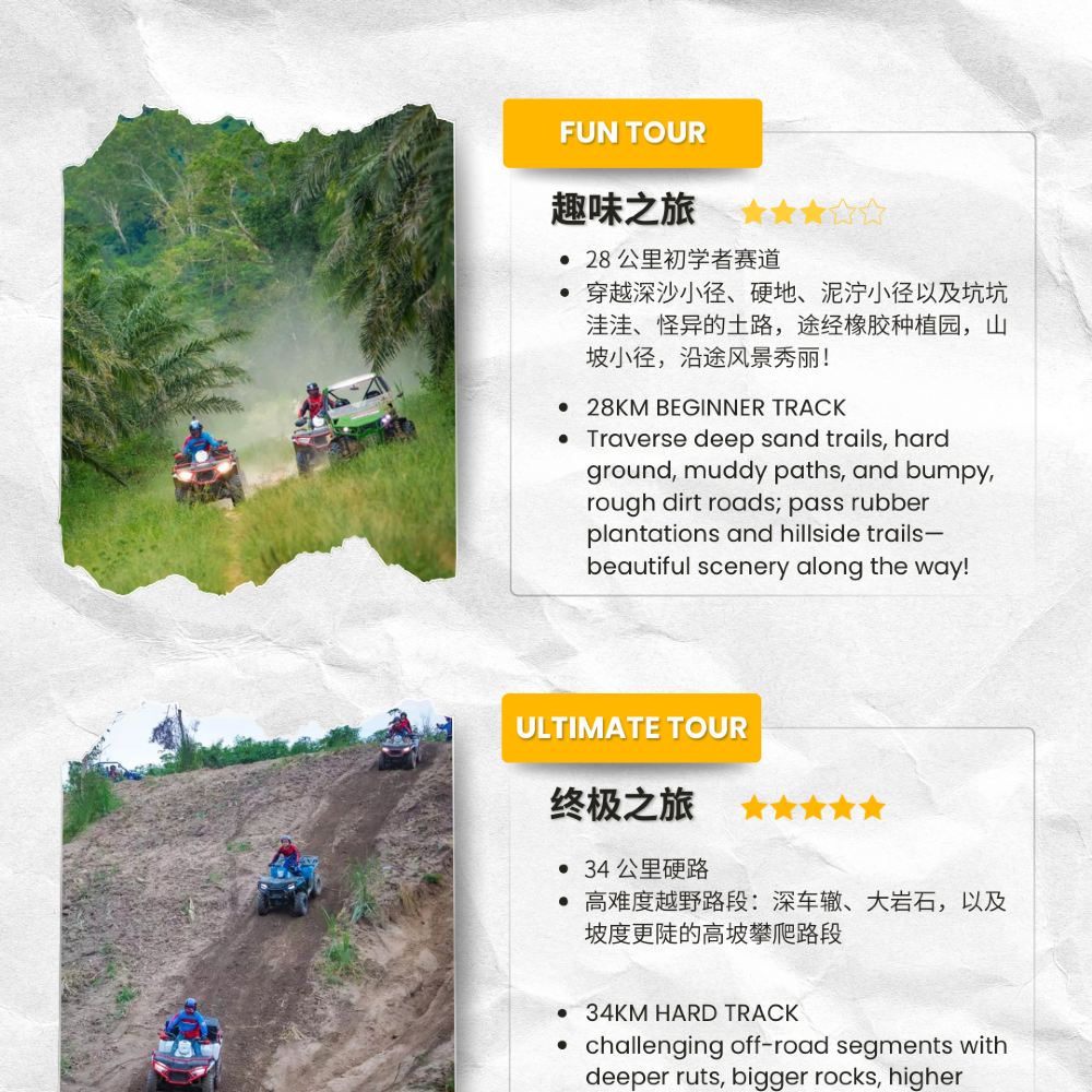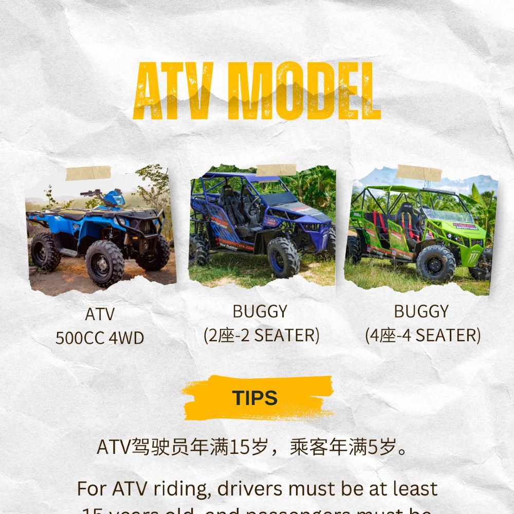 從未騎過 ATV?別擔心——無需任何駕駛經驗即可享受這次旅程,您將駕駛美國進口 ATV 和越野車。