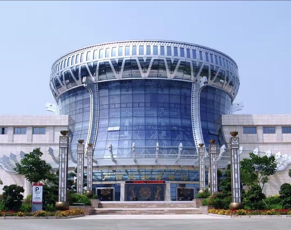 ▲ 廣西民族博物館位於中國廣西南寧市青秀山風景區,是一座以收藏、研究和展示廣西12個世居民族傳統文化為主題的國家一級博物館,兼具對東南亞民族文化的展示與研究功能。 博物館佔地130畝,主樓建築面積2.8萬平方米,藏品超5萬件(套),其中銅鼓收藏量為全球之尖,並設有8個固定陳列展覽及露天展示園。