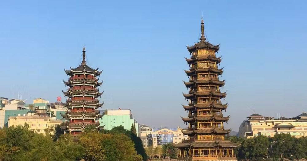 ▲ 桂林日月雙塔,銅塔所有構件如塔什、瓦面、翹角、鬥拱、雀替、門窗、柱樑、天面、地面完全由銅壁畫裝飾,整座銅塔創下了三項世界之——世界上高的銅塔,世界上高的銅質建築物,世界上高的水中塔。 月塔高35公尺共七層,為琉璃塔。每層的雕花彩繪門窗寓意不同的主題,富含中國傳統韻味,透過水下湖底一條10公尺長的湖底隧道與日塔連接,其地宮之中有桂林明代青花梅瓶大型壁畫。杉湖日月雙塔已成為觀賞桂林城市精華美景的勝地。