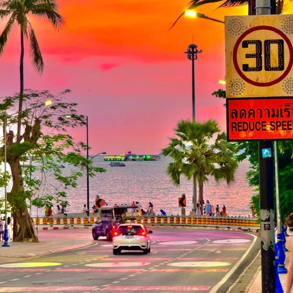 ▲ 司機送至Terminal 21正門左前方馬路觀景台,無遮蔽拍攝落日沈入海岸線。 **剪影拍攝指南**:提供手機參數(iPhone人像模式-自然光-曝光-1.0),捕捉「人像+橙紫海景」大片。