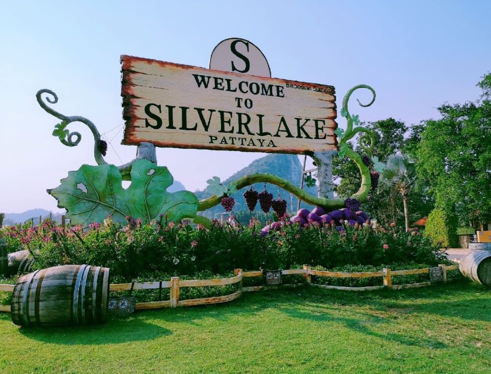 ▲ **田園攝影**:紫色葡萄藤架+白色風車屋。 **品酒休憩**:自選麝香葡萄冰酒(150泰銖/杯)。