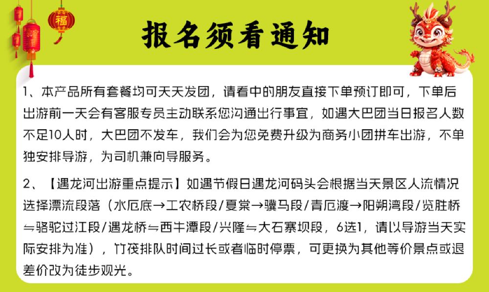 3、暑期及節假日期間因遊客多排隊、塞車等因素,出發時間會比平日提早,具體時間以導遊實際通知為準。