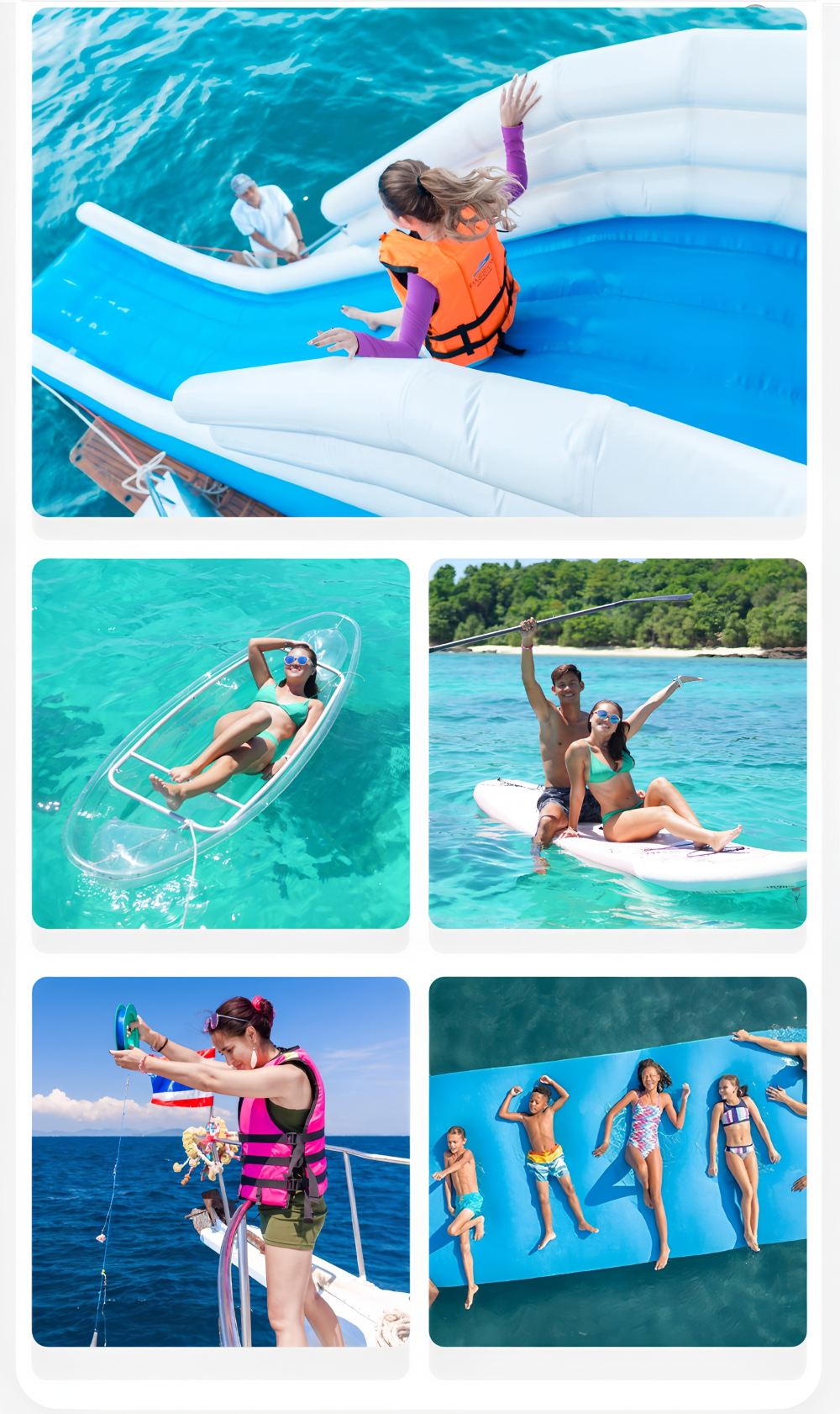 遊樂設施:水上滑梯、槳板、手圈海釣工具、浮潛工具(一次性咬嘴、呼吸管、泳鏡)、海上浮毯