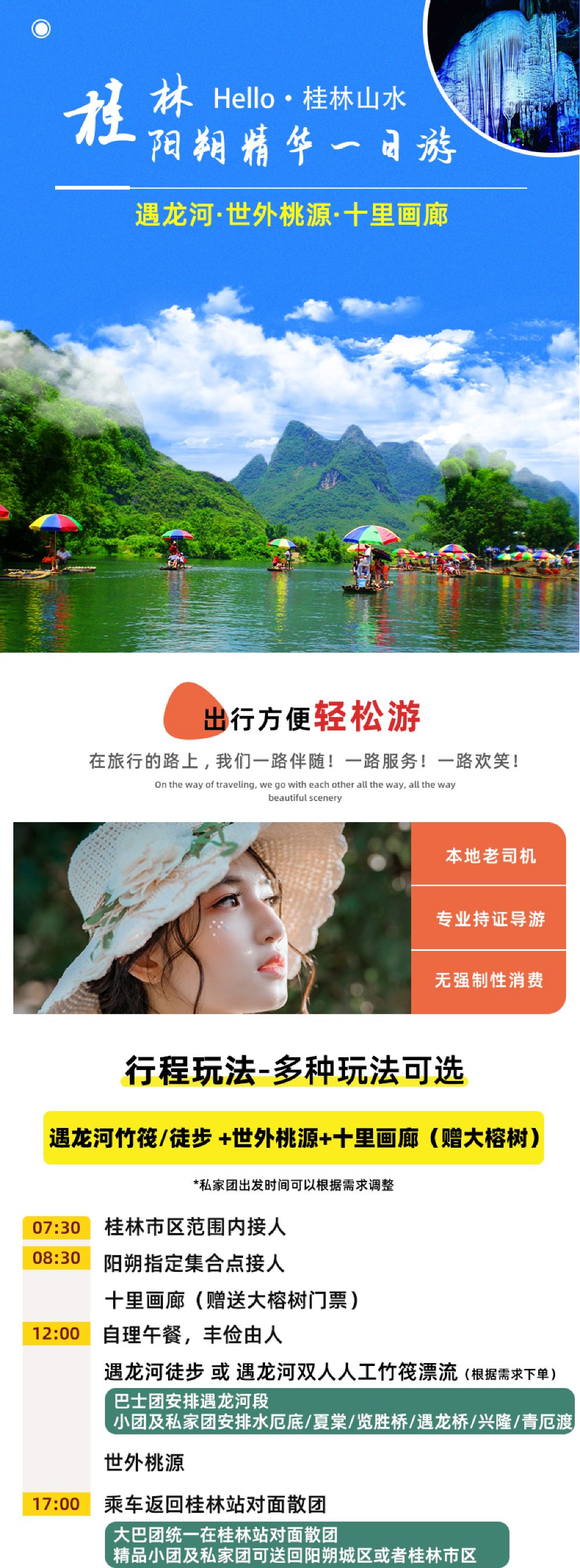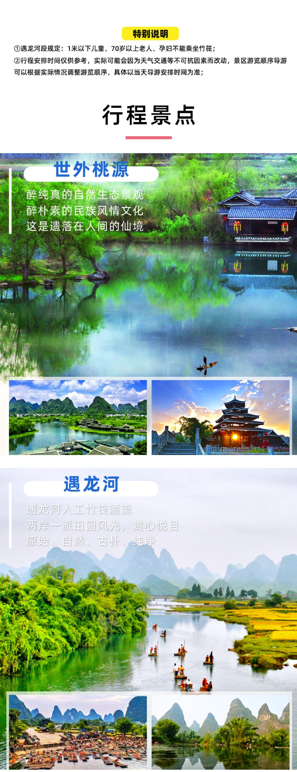 7.如遇節假日【特別是春節、五一、國慶黃金周】遇龍河碼頭會根據當天設施人流情況選擇漂流段落(水厄底工農橋段/夏棠驥馬段/青厄渡陽朔灣段/覽勝橋駱駝過江段/遇龍橋西牛潭段/興隆大石寨壩段,6選1,請以導遊當天實際安排為準),竹筏排隊時間過長或臨時停票,可更換為其他等價景點或退差價改為徒步觀光。