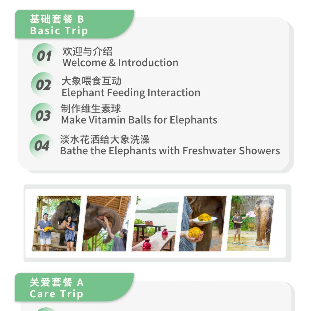 【互動項目】:深入體驗象伕文化;親手切水果、配製營養餐,為大象刷背、沖涼,觀察皮膚狀態