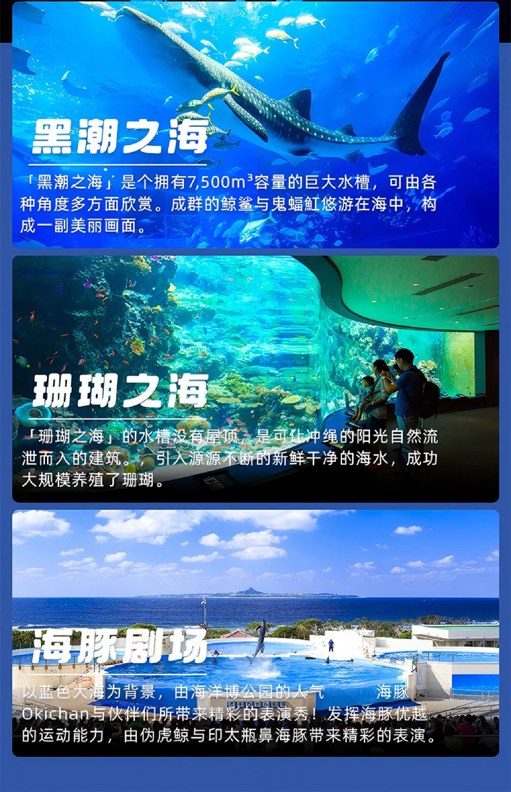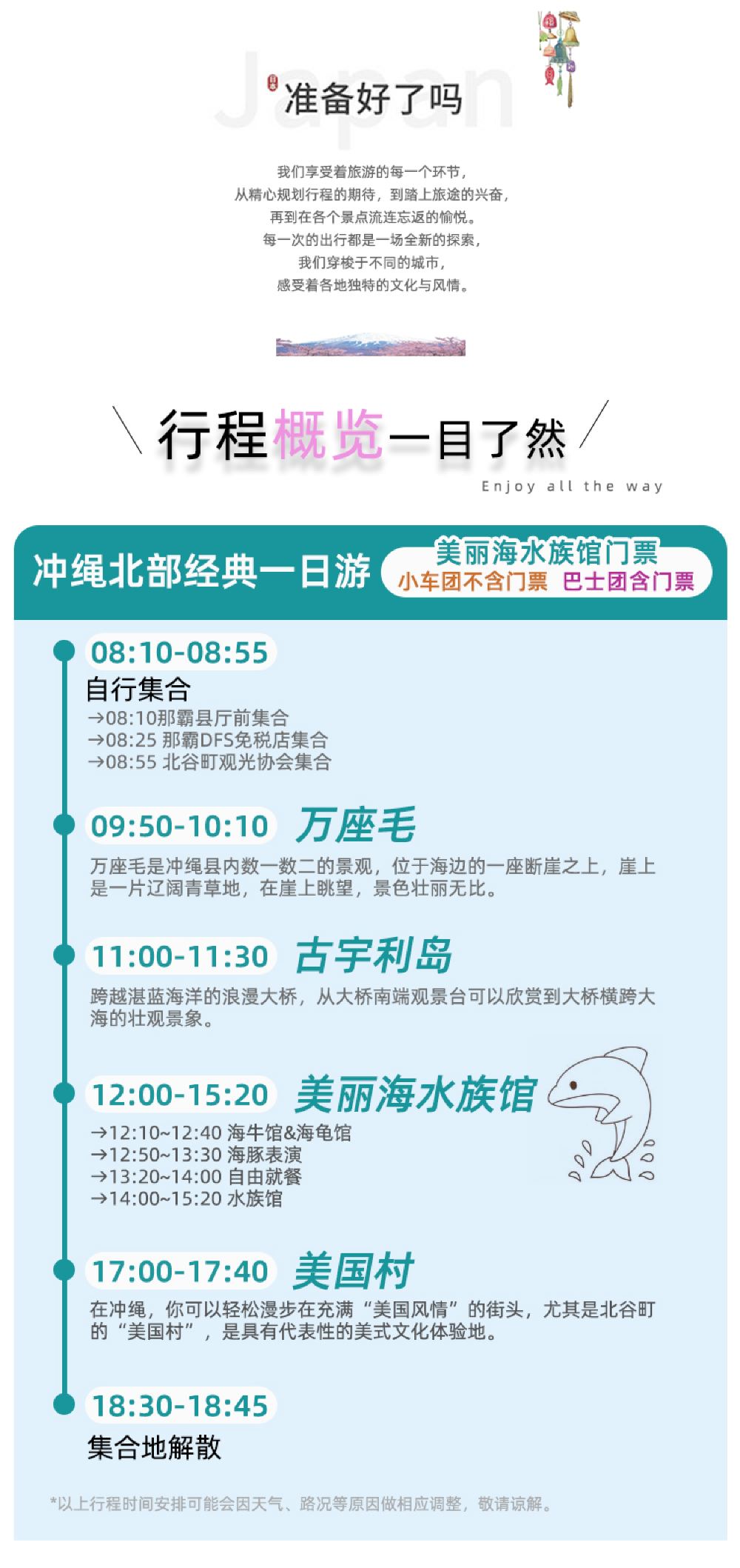 景點明細:萬座毛-遊覽 20 分鐘-古宇利島-遊覽 30 分鐘-沖繩美麗海水族館-遊覽 210 分鐘-美國村-遊覽 40 分鐘