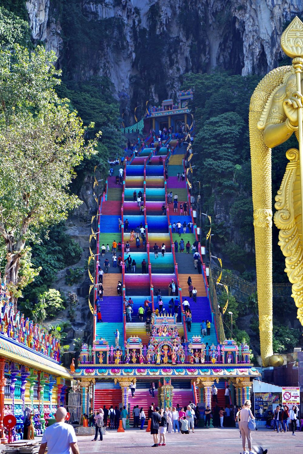 ▲ 黑風洞是馬來西亞印度教聖地,位於吉隆坡北郊,由石灰岩溶洞群構成。需攀登272級彩虹階梯,抵達主廟洞,洞內供奉印度教神明,宗教氛圍濃厚。洞外矗立著42.7公尺的穆魯干金色神像。