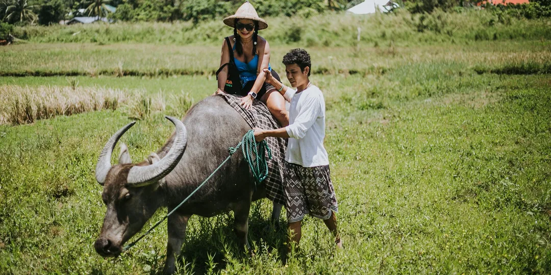 嘗試搗米、刨椰絲、編織竹籃和水牛犁田