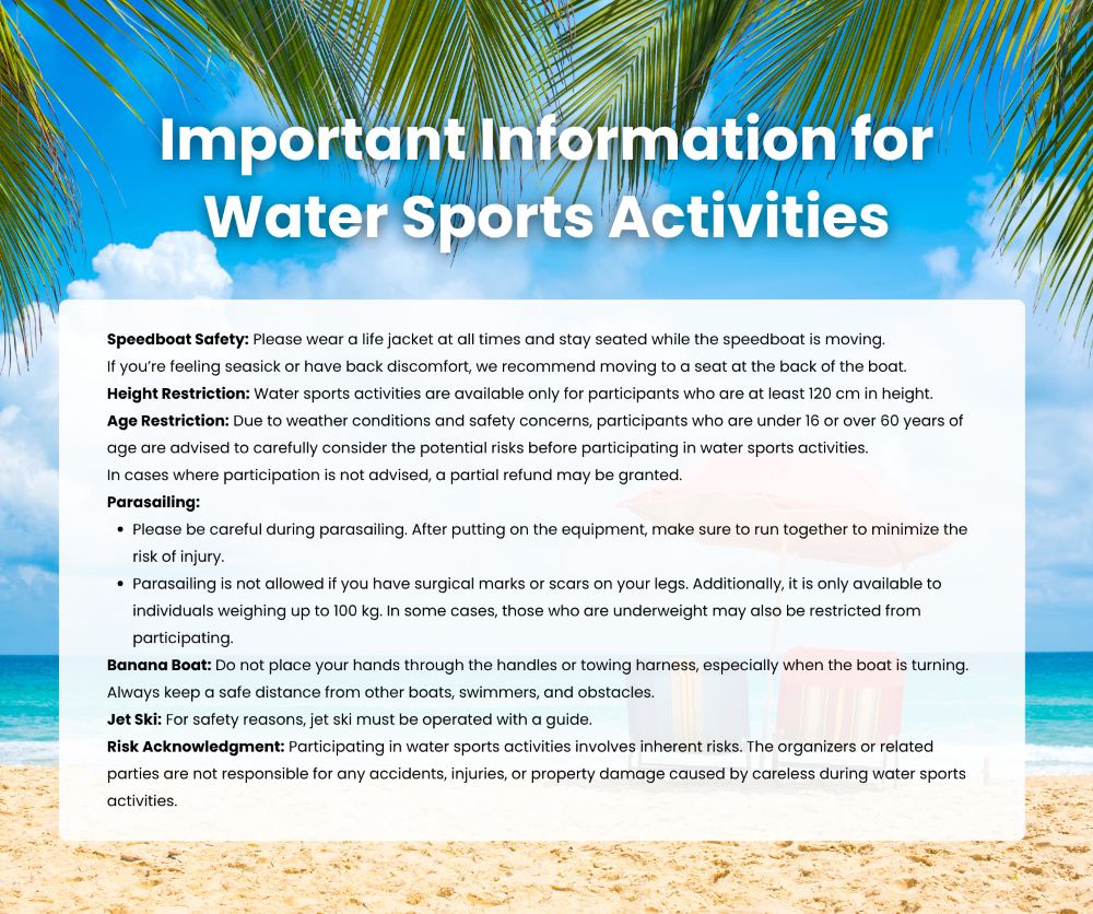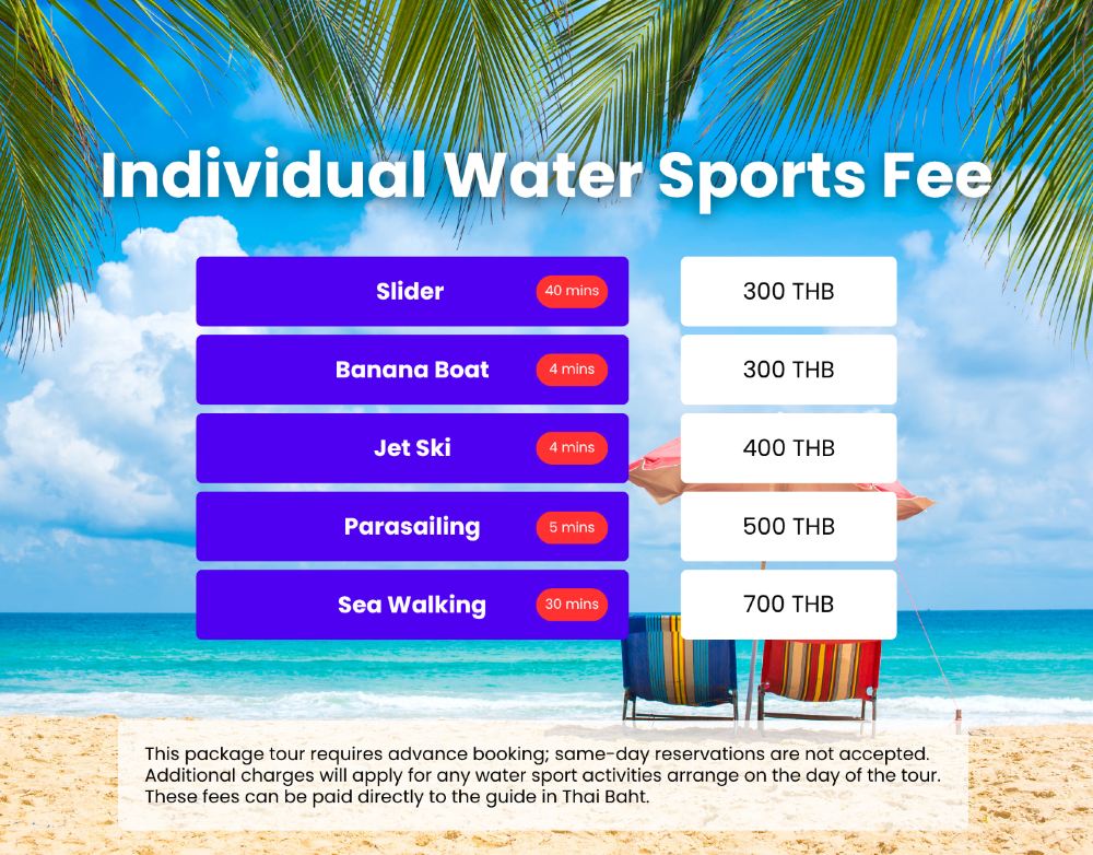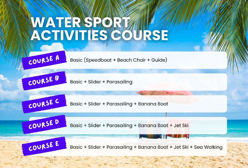 包含拖曳傘、海底漫步、水上摩托車、浮潛和香蕉船等活動。