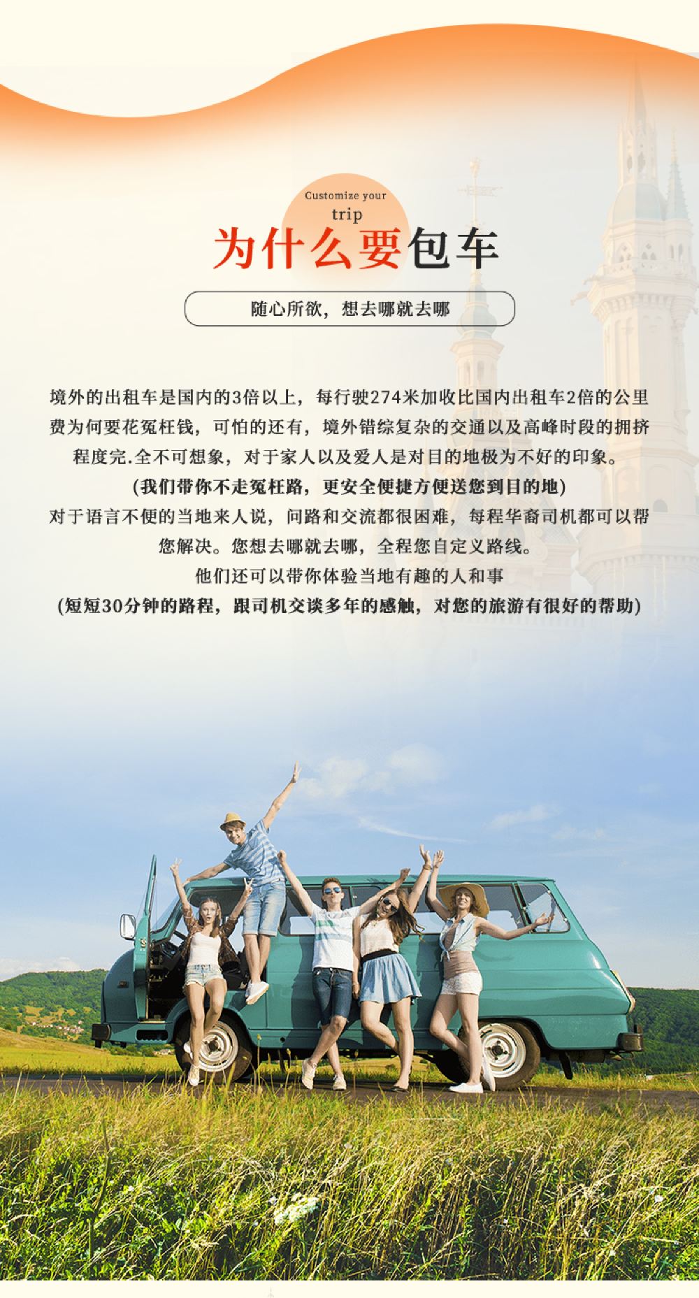 本產品為包車服務,中文專車上門接駁,不包含景點門票和用餐費用,用車服務時長10小時,超時需要根據車型支付相應的超時服務費,如有其他服務需求,請諮詢客服。