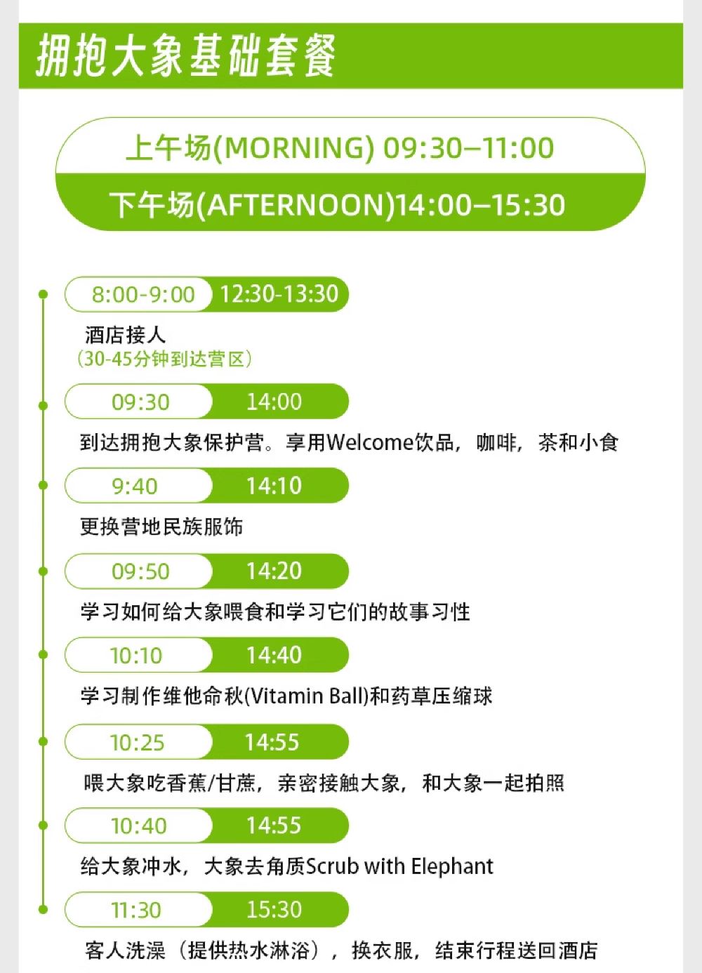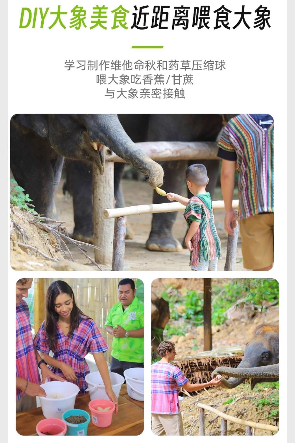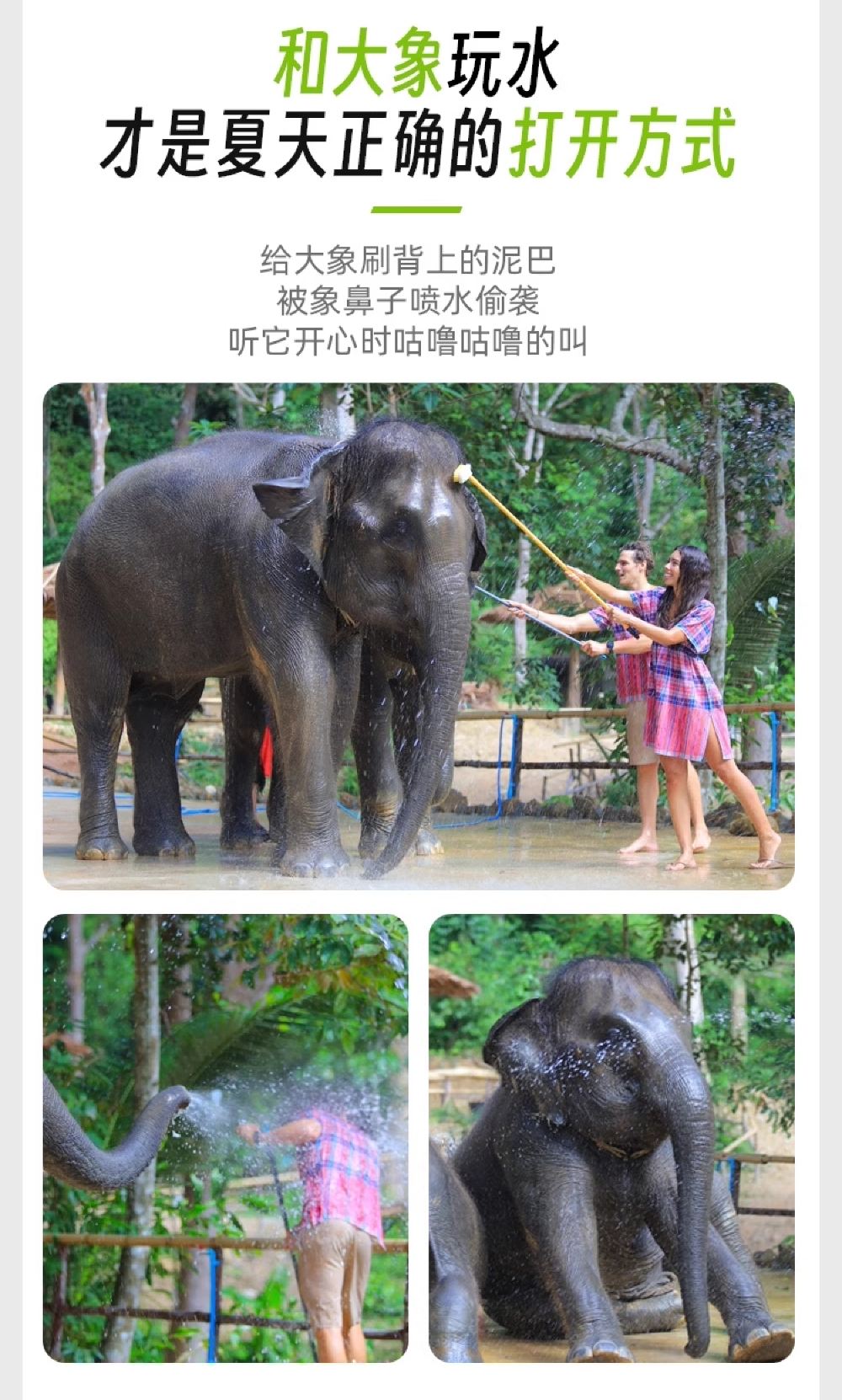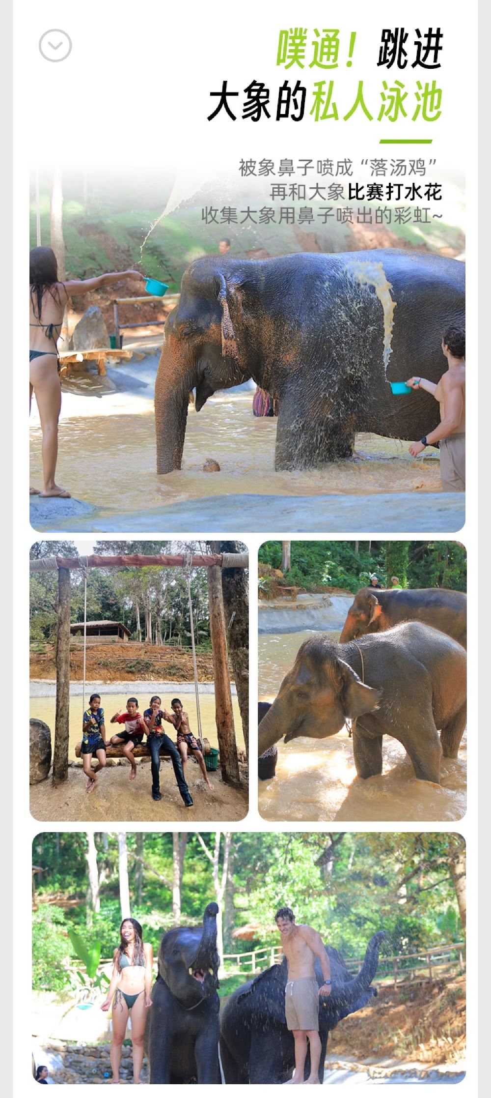 零距離互動玩耍,體驗親密餵食大象;和大像做泥浴spa,洗白白後打水仗