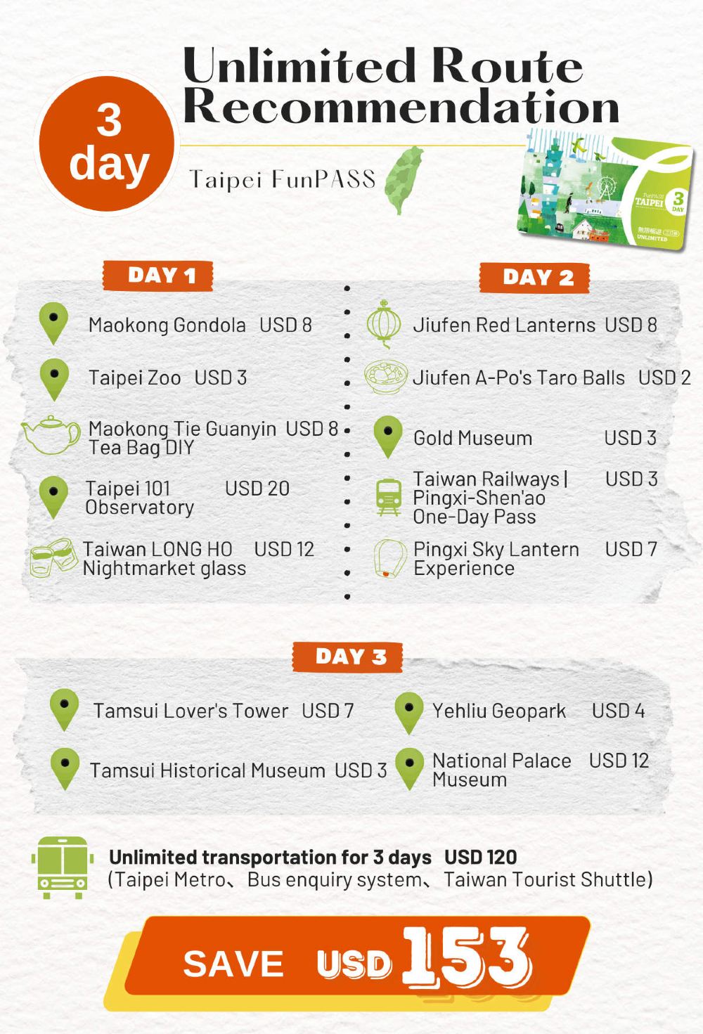 - 效期內憑卡可參觀各景點一次:台北101觀景台、國立故宮博物院、士林官邸正館、美麗華百樂園摩天輪、台北兒童遊樂園門票+設施四次券、淡水古蹟博物館、黃金博物館、野柳地質公園、朱銘美術館、波麗士派出所電子天燈券、國家海洋科學技術博物館、台北動物園、貓空纜車雙程票、台灣袖珍博物館、和平島公園、台北當代藝術館一般票、臺北市立美術館全票、林本源園邸全票、國立台灣博物館本館+古生物館全票、國立台灣博物館南門園區展示館門票、國立台灣博物館鐵道部園區全票、北投文物館參觀券、淡水情人塔觀景體驗門票(暫停營運中)、台北流行音樂中心、陽明海洋文化藝術館、自來水園區、巫登益美術館、經國七海文化園區