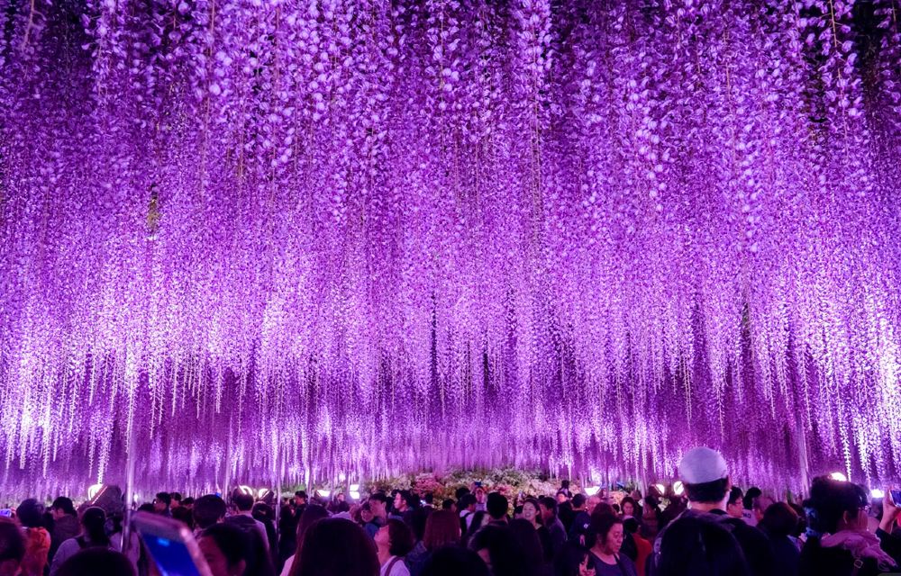 ▲ 公園的象徵——「奇跡之大藤」以超過80公尺的夢幻藤棚為舞台,將春日紫藤的浪漫美態以燈光重現。藤色LED燈飾在寒冬夜空中宛如花串搖曳,在微風中輕輕晃動,營造出彷彿藤花在冬季綻放的動態燈光藝術,令人驚嘆不已。
