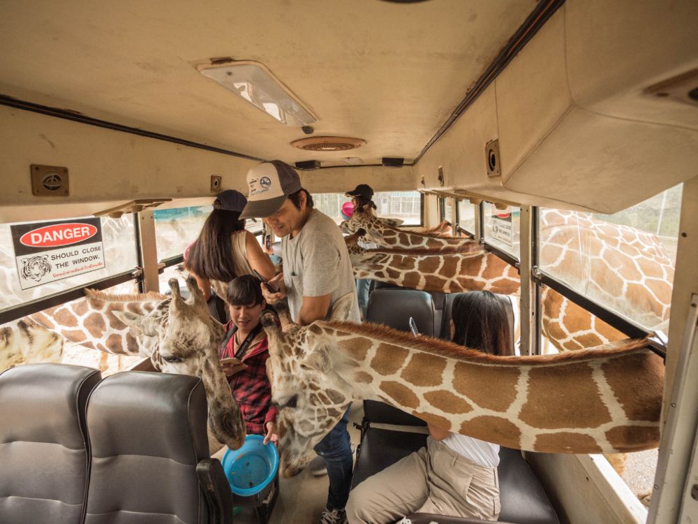 北碧府動物園坐巴士餵長頸鹿親密互動
