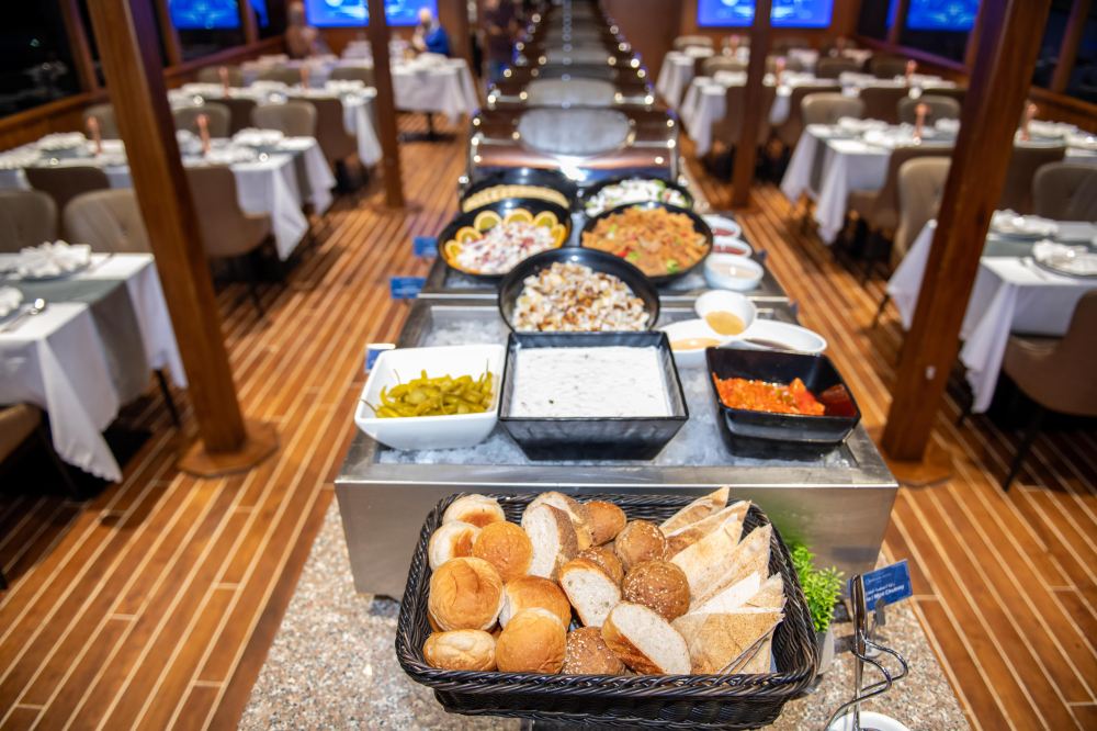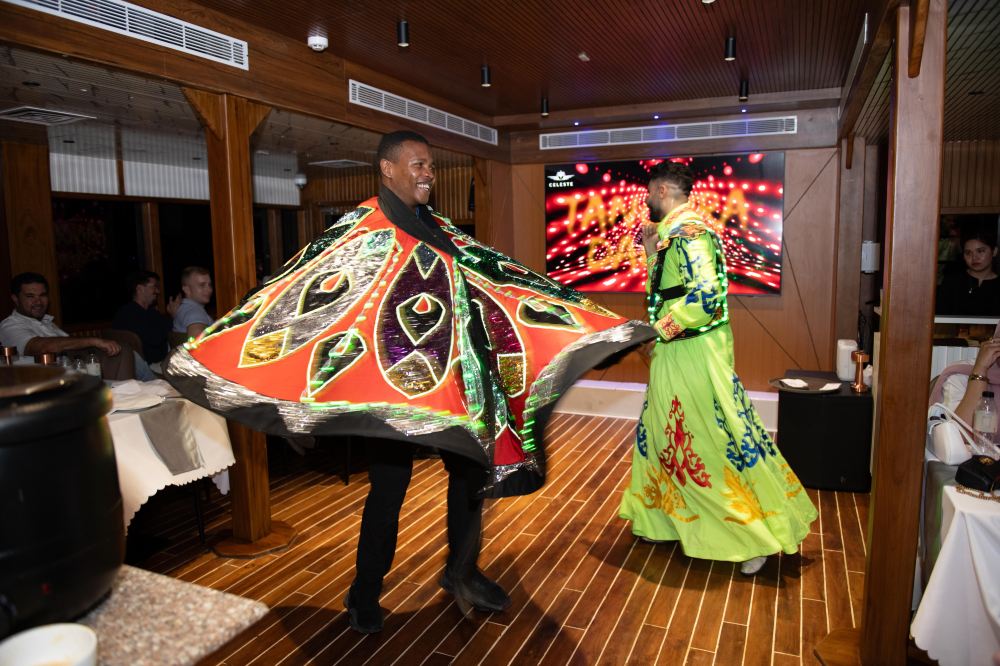船上提供豐盛的國際自助晚餐,包含各種素食和非素食選擇,如傳統的阿拉伯開胃菜、美味的烤肉、新鮮的沙拉和精緻甜點等,還有無限暢飲的軟性飲料、水、茶和咖啡。此外,船上還會有傳統的旋轉舞(Tanura)表演,舞者身著色彩鮮豔的服裝,伴隨著音樂旋轉,為遊客帶來獨特的文化體驗。