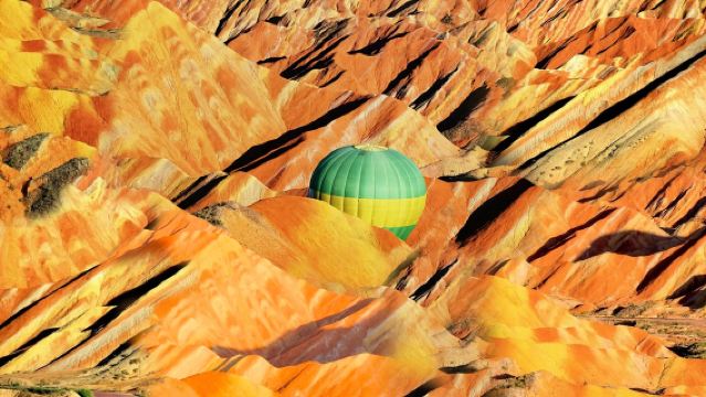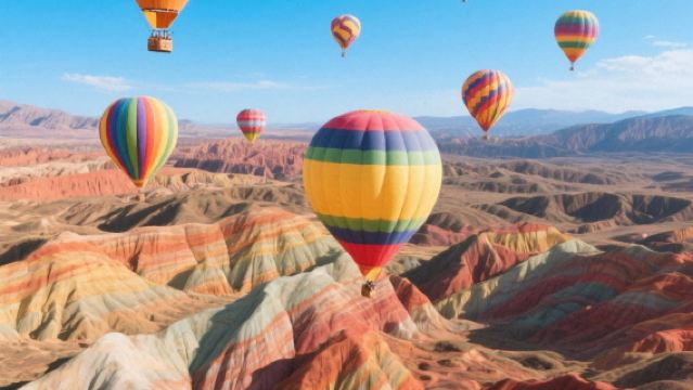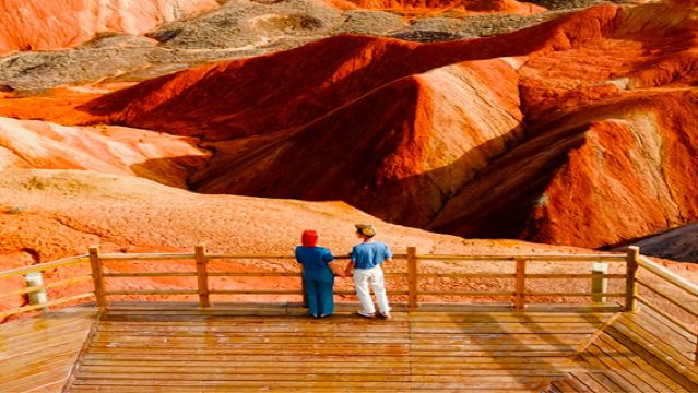 與張掖導遊會合,參觀張掖彩虹山。張掖彩虹山是丹霞地形的一種,形成於前侏羅紀至第三紀,距今約200萬年。它是中國乾旱地區最典型的丹霞地形,在世界上罕見,是中國丹霞地形中規模最大、品質最好、地形形態最豐富的丹霞地形。