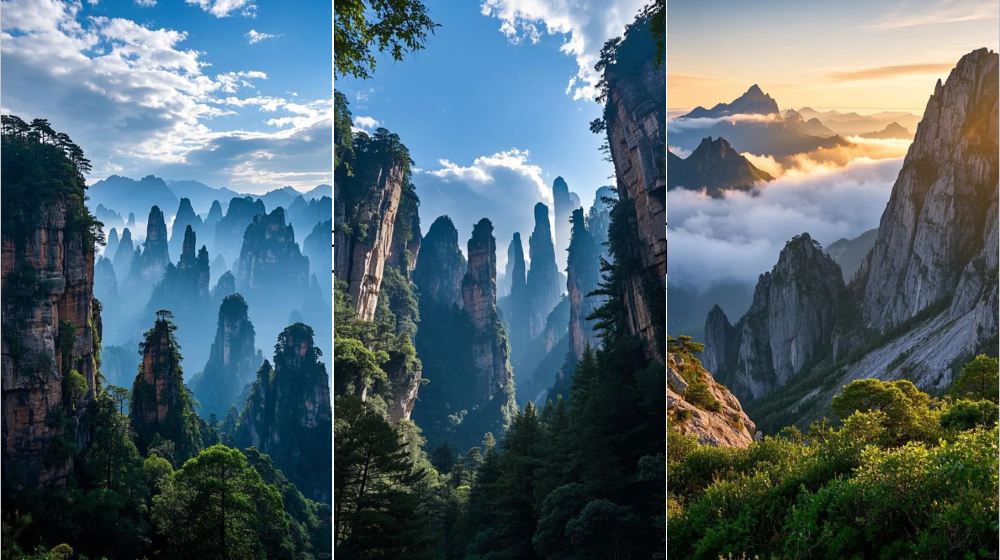 - 10:00–13:30:從南大門出發,搭乘黃石寨纜車快速上山 (10:30–11:30)。抵達山頂後,盡情欣賞「三千奇峰」的壯麗景色——從高處俯瞰,整片山巒宛如一座巨大的天然雕塑園!接著探索黃石寨核心景區,站在摘星台上,彷彿伸手就能觸摸雲朵。然後前往五指峰,那逼真的造型讓人不禁懷疑這些「手指」是否真的會動!(此處可安排 1 小時午餐時間。)